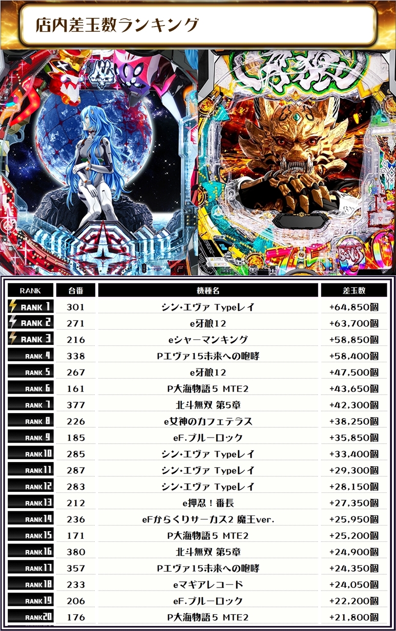 最後に、この日の【店内差玉数ランキング】をどうぞ✨