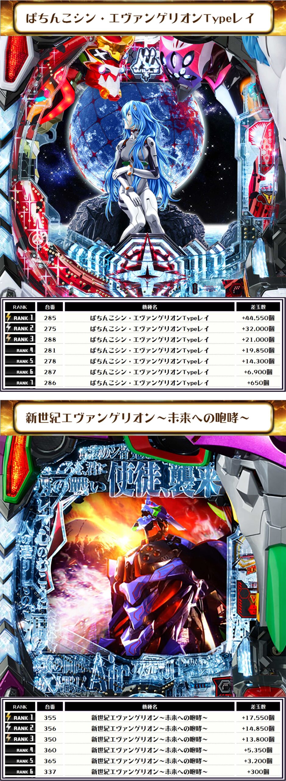 続く2位には【e聖戦士ダンバイン3 GREA・220番台】の+48,250発、そして3位には【ぱちんこシン・エヴァンゲリオンTypeレイ・285番台】の+44,550発がランクインっ🏆