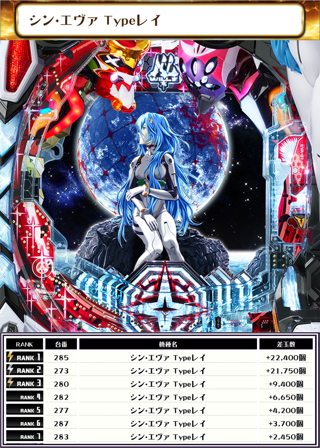 そして、毎回注目のエヴァシリーズは、エヴァ15未来への咆哮が5台、シン・エヴァ Typeレイ2台ランクイン🔥🔥🔥 今回は夕方前に訪問したのですが、エヴァシリーズや海物語シリーズの稼働が多く、取材機種以外にも全体的に優秀台が多かった印象でした👍