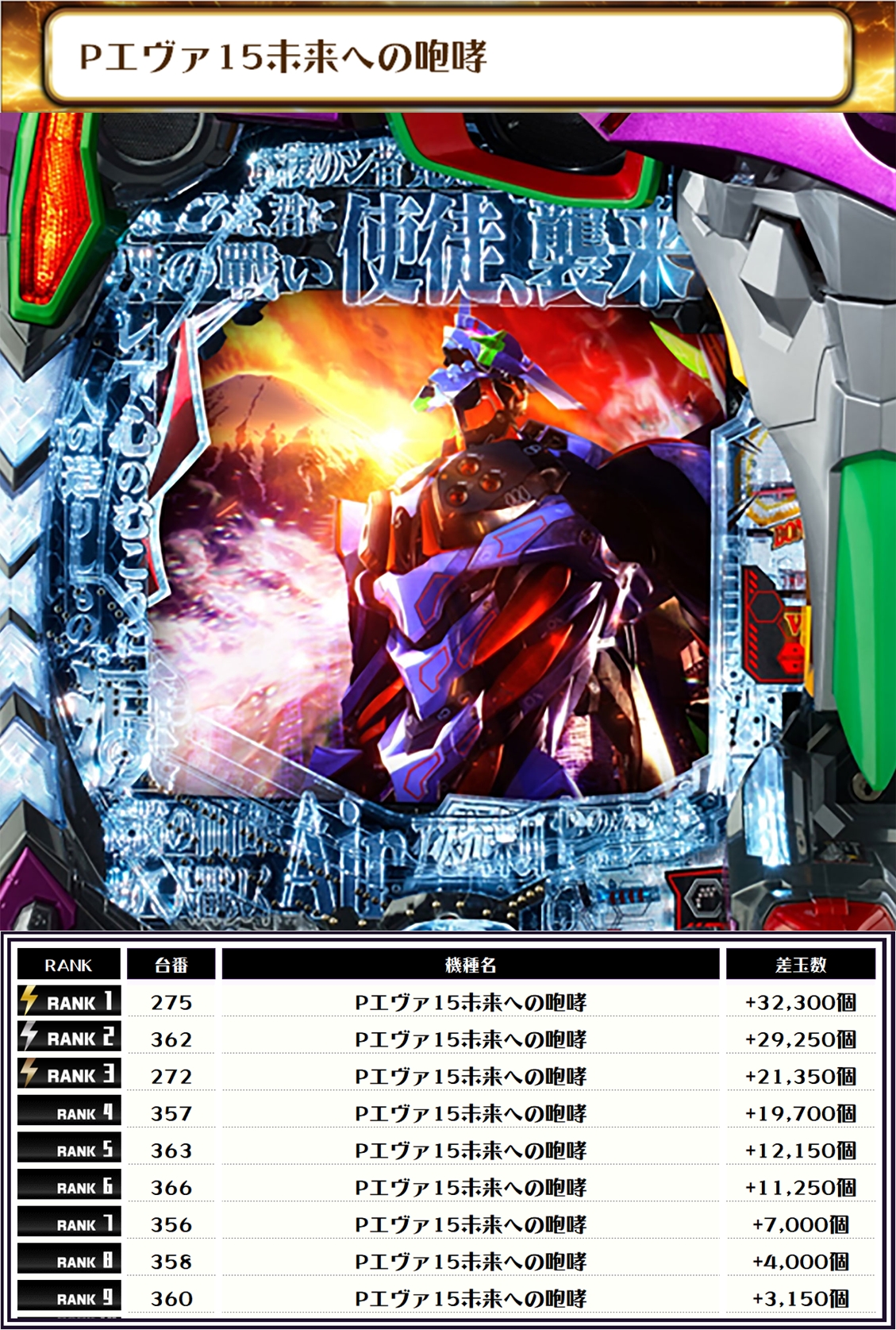 そして、毎回注目のエヴァシリーズは、エヴァ15未来への咆哮が4台、シン・エヴァ Typeレイ2台ランクイン🔥🔥🔥 今回は午後早めに訪問したのにもかかわらず、エヴァシリーズや海物語シリーズの稼働が多いだけでなく、あちらこちらに優秀台が多かった印象でした👍