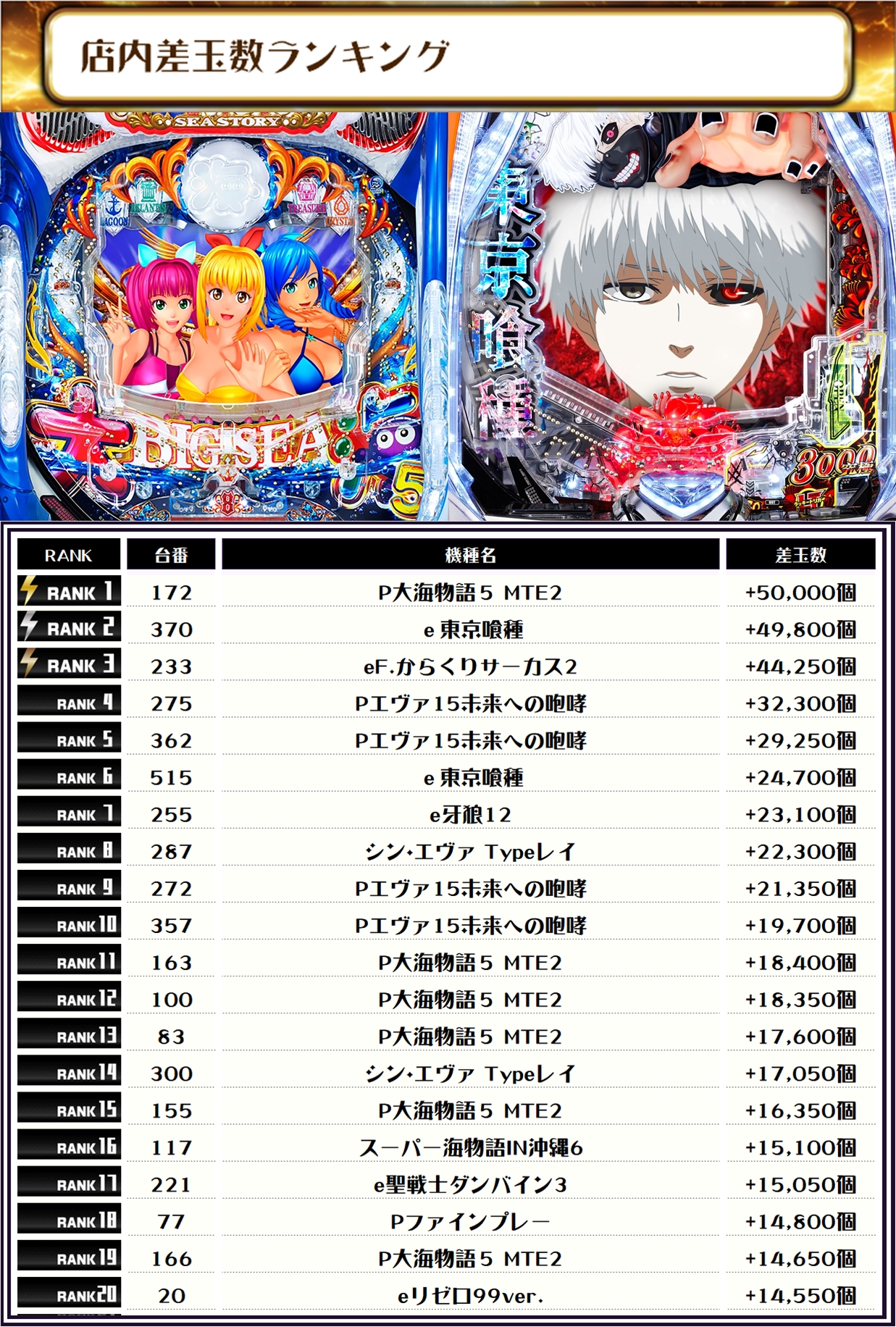 最後に、この日の【店内差玉数ランキング】をどうぞ✨