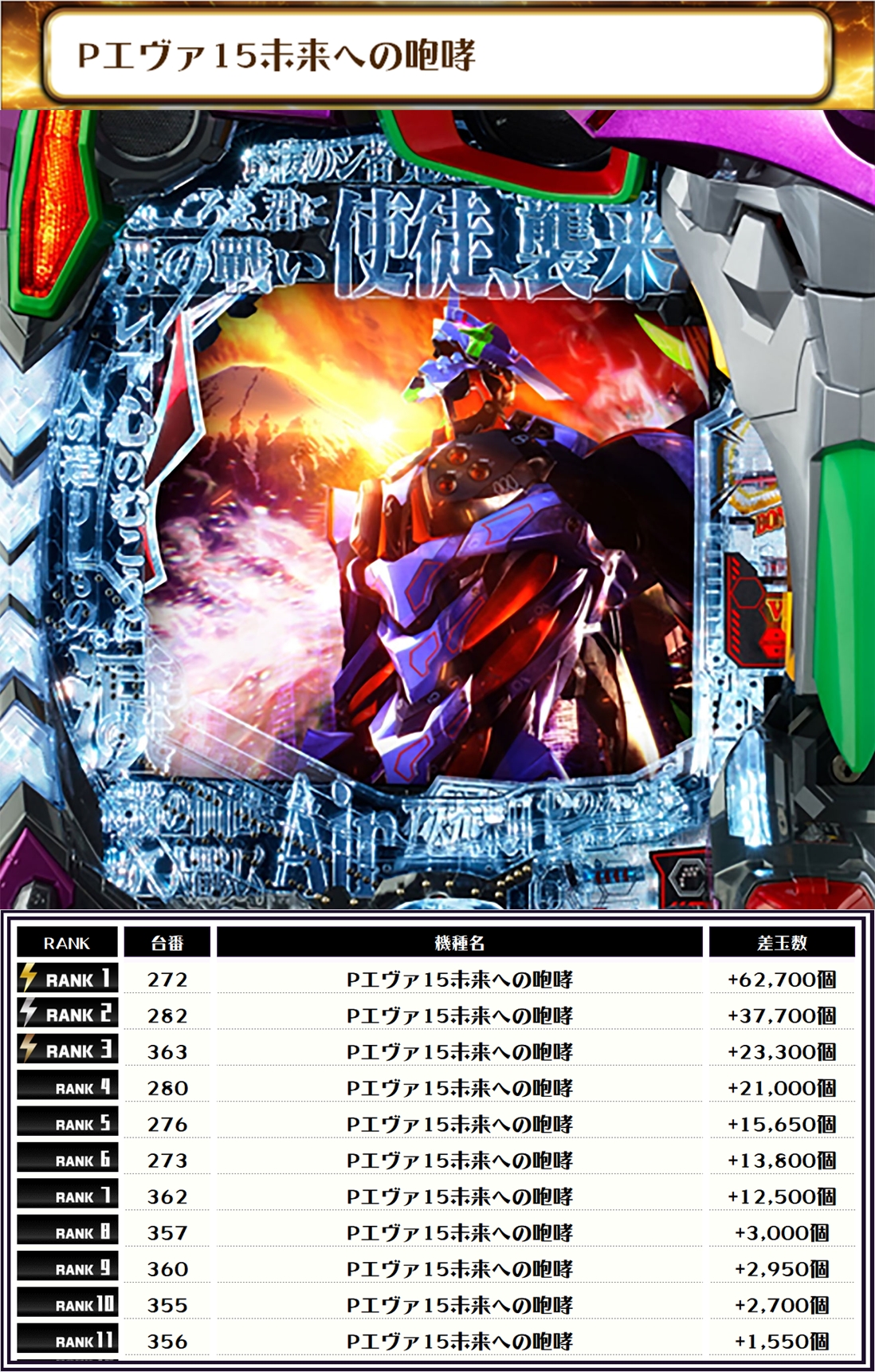 続く2位は【Pエヴァ15未来への咆哮・272番台】の+62,700個、そして3位も同じく【Pエヴァ15未来への咆哮・282番台】の+37,700個がランクインっ🏆