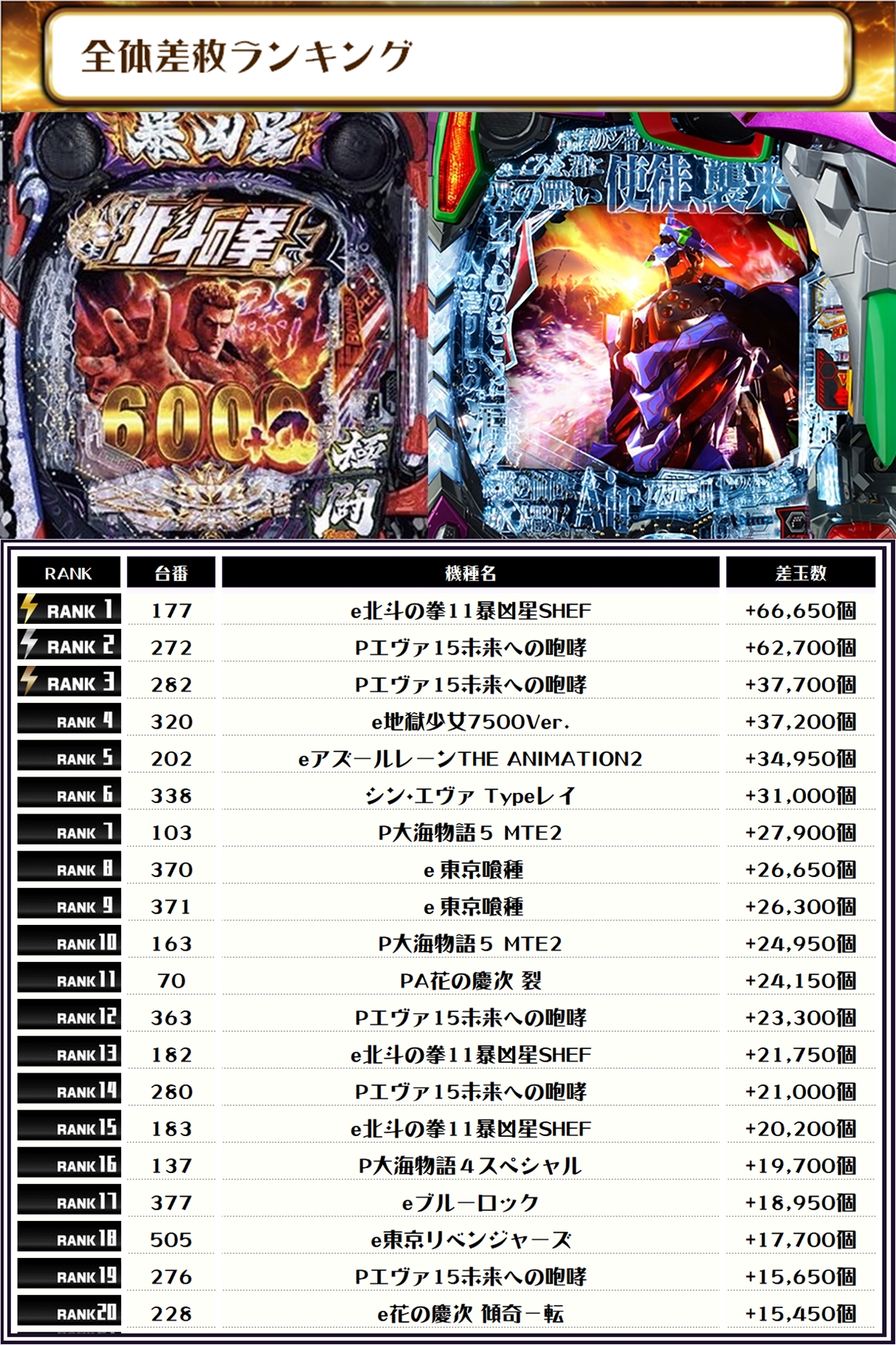 今回の出玉TOPは【e北斗の拳11暴凶星SHEF・177番台】の+66,650個‼️