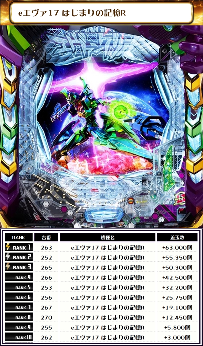 続く2位は【eエヴァ17はじまりの記憶R・263番台】の+63,000個、そして3位は【e牙狼12黄金騎士極限・205番台】の+55,800個がランクインっ🏆