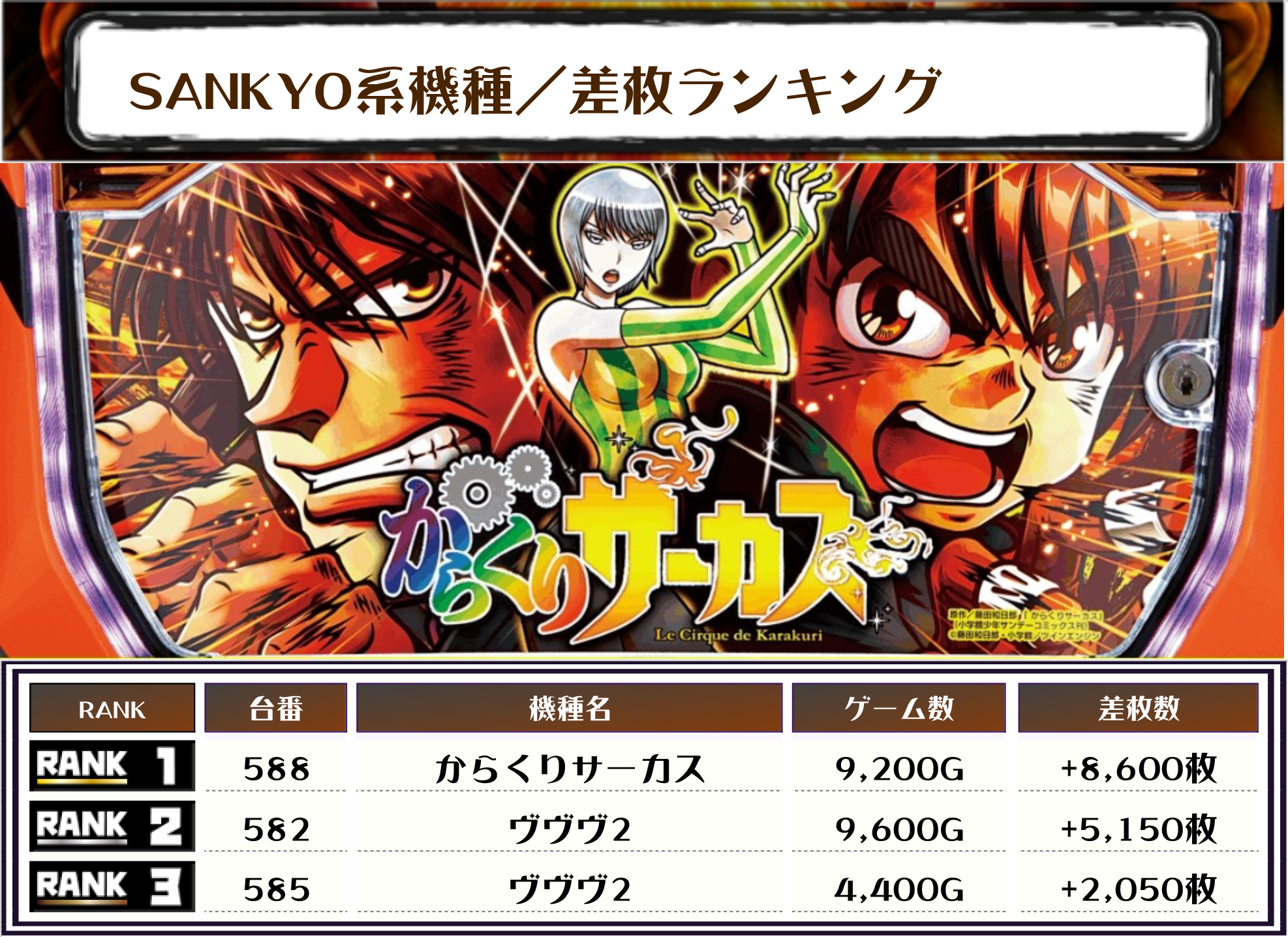 ということで、この日のトップ差枚は【からくりサーカス・588番台】で+8,600枚👑👑👑