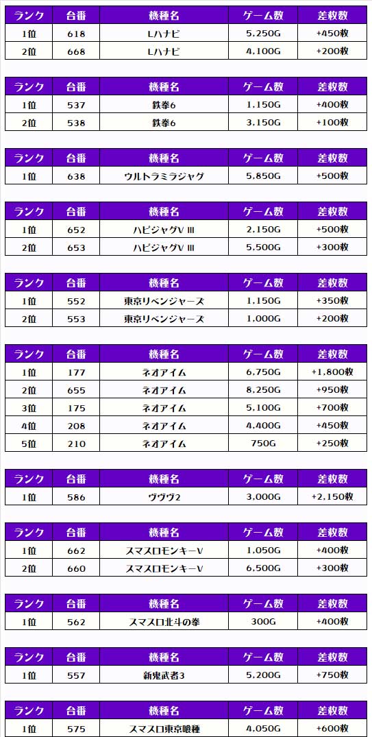 今回ピックアップしたのは稼働が高く、優秀台が多かったと思われる機種になります👍