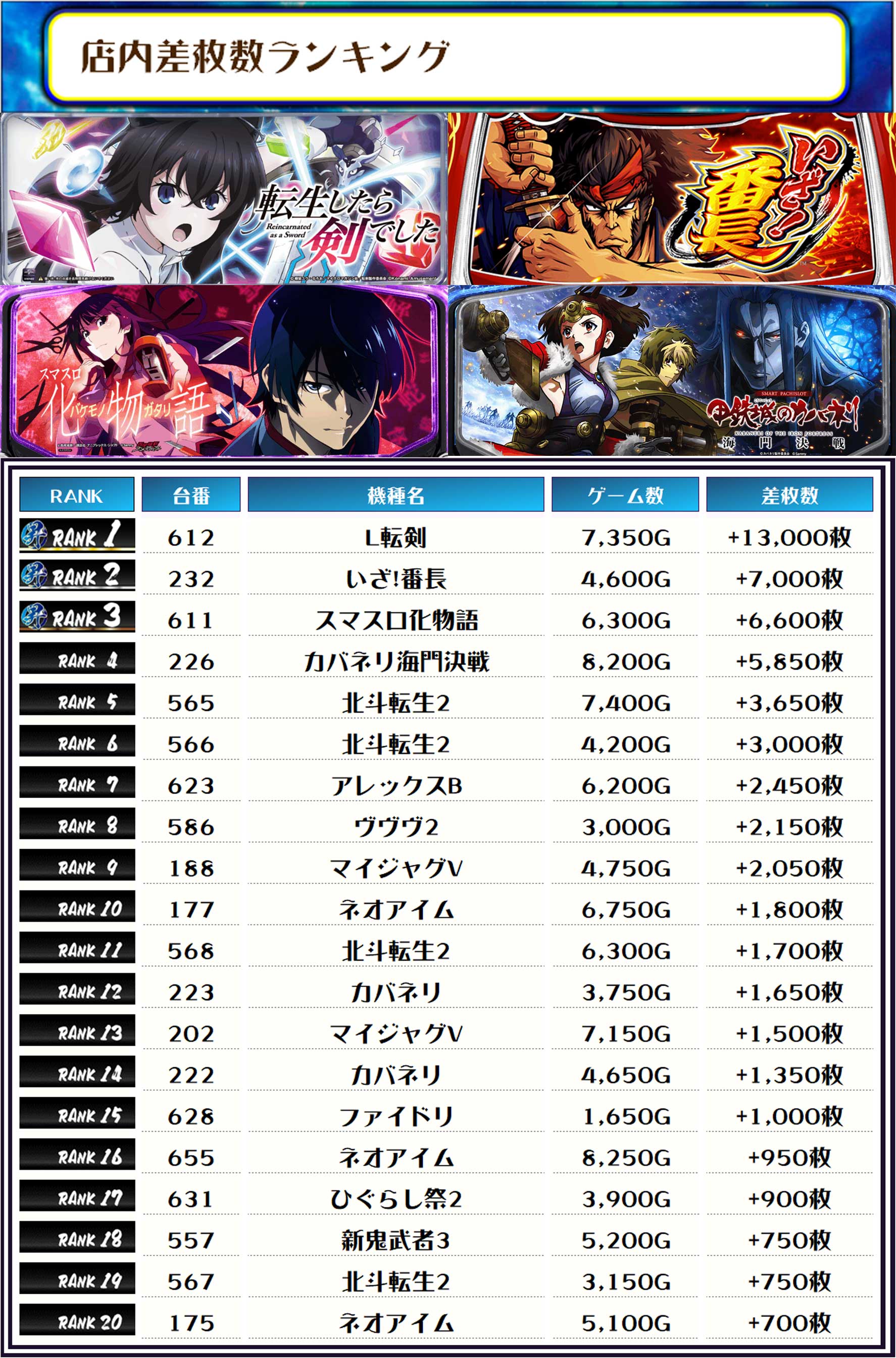 2位には【いざ!番長・232番台】の+7,000枚、そして3位には【スマスロ化物語・611番台】の+6,600枚がランクインしましたっ👏👏👏