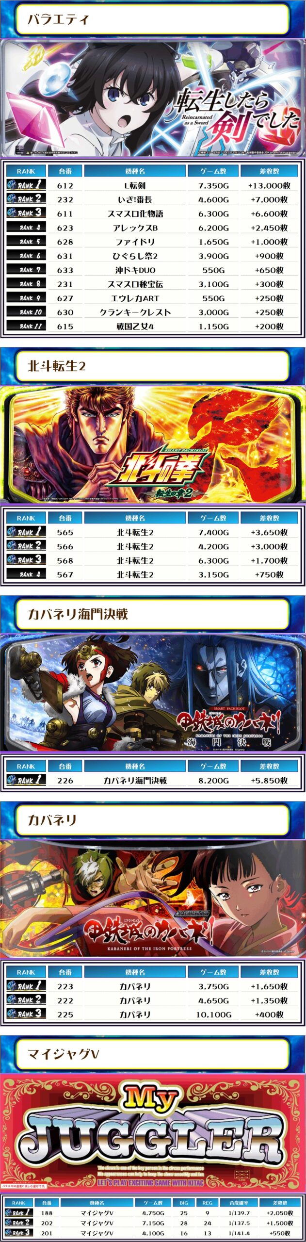 この日の全体差枚トップは【L転剣・612番台】で+13,000枚っ🎉🎉🎉