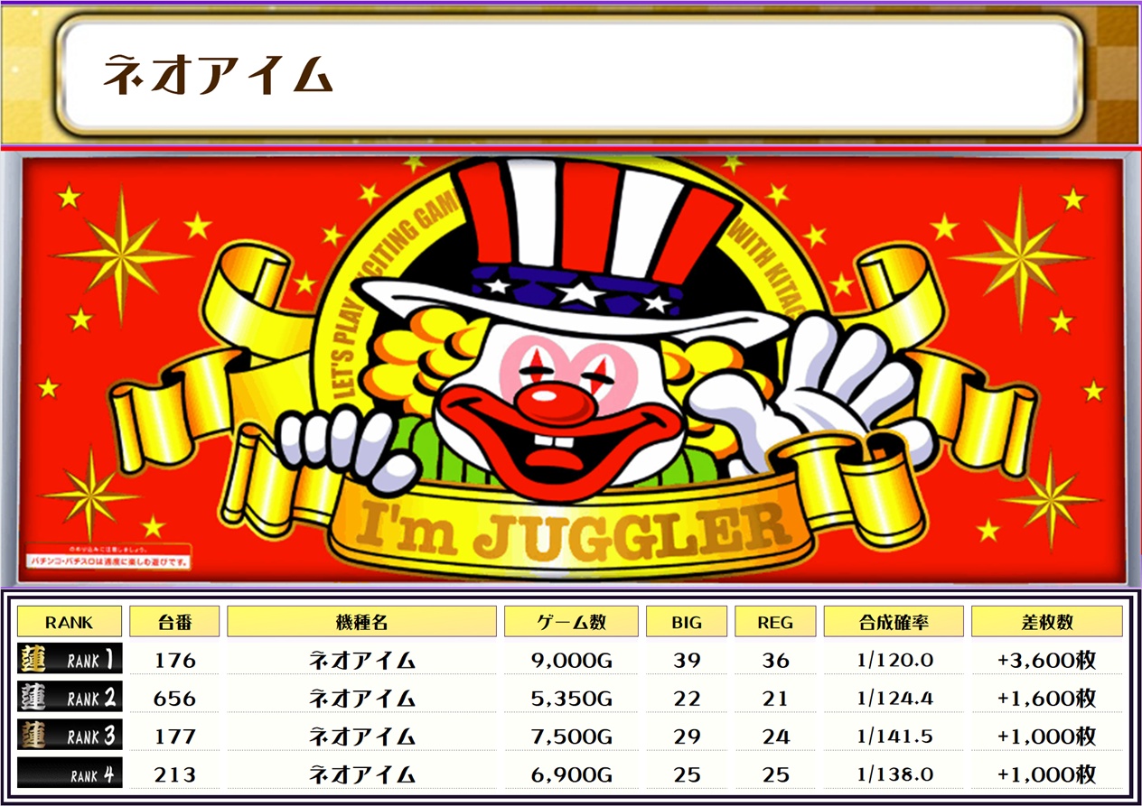2位には銭形5・610番台で+4,850枚、3位には【ネオアイム・176番台】の+3,600枚がランクインですっ❗️🏆🏆🏆🏆
