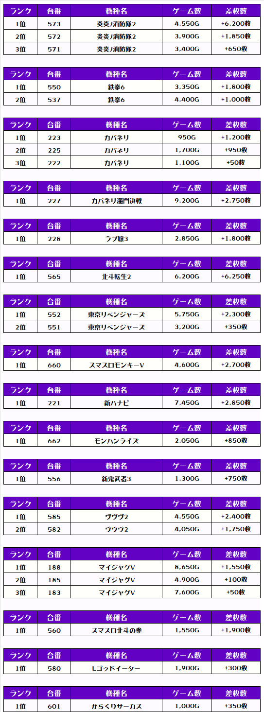 2位には【炎炎ノ消防隊2・573番台】で+6,200枚、3位には【いざ!番長・232番台】の+4,450枚がランクインですっ❗️🏆🏆🏆🏆