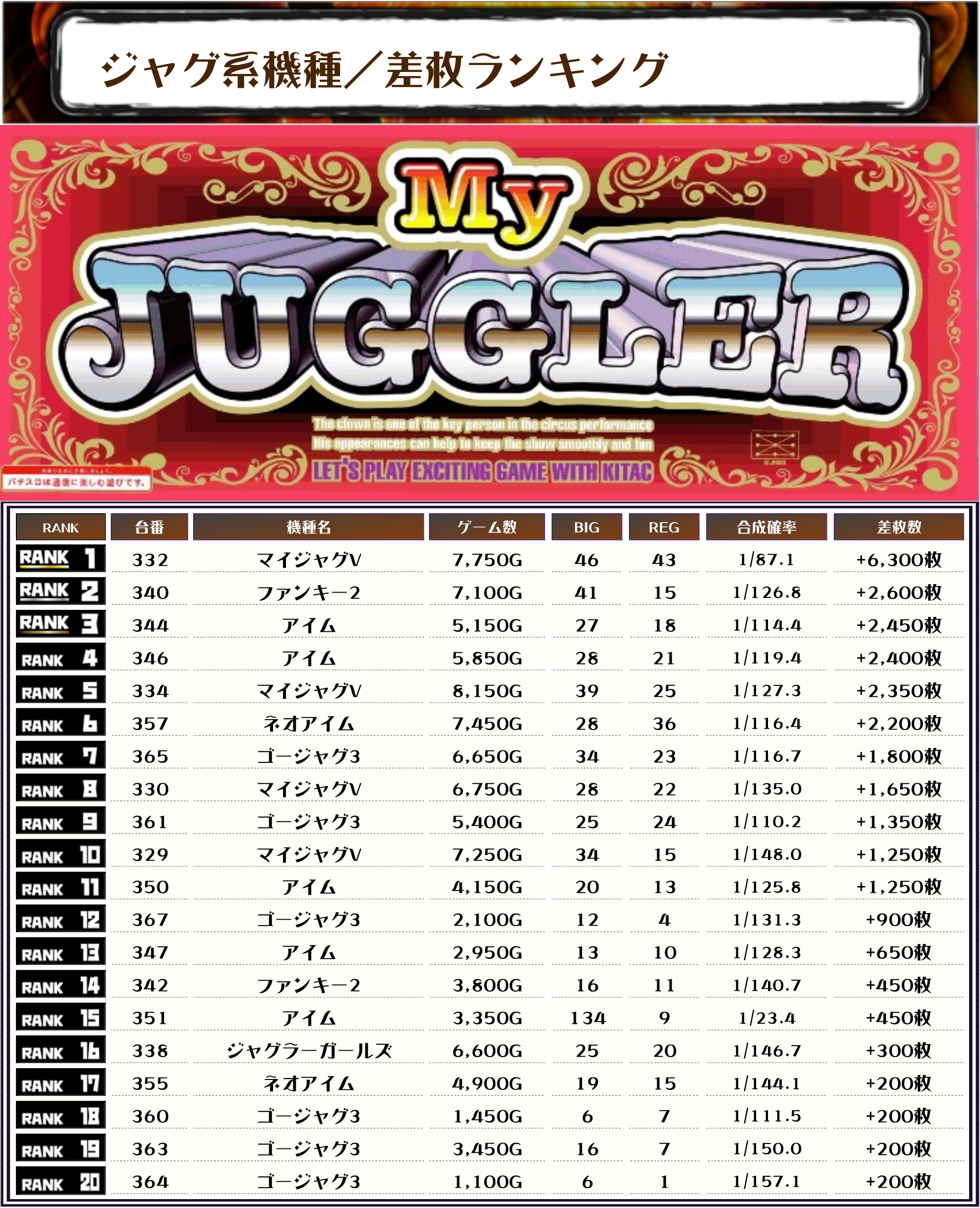 また、2位にはファンキー2・340番台】+2,600枚、3位にはアイム・344番台】の+2,450枚がランクインしました🏆