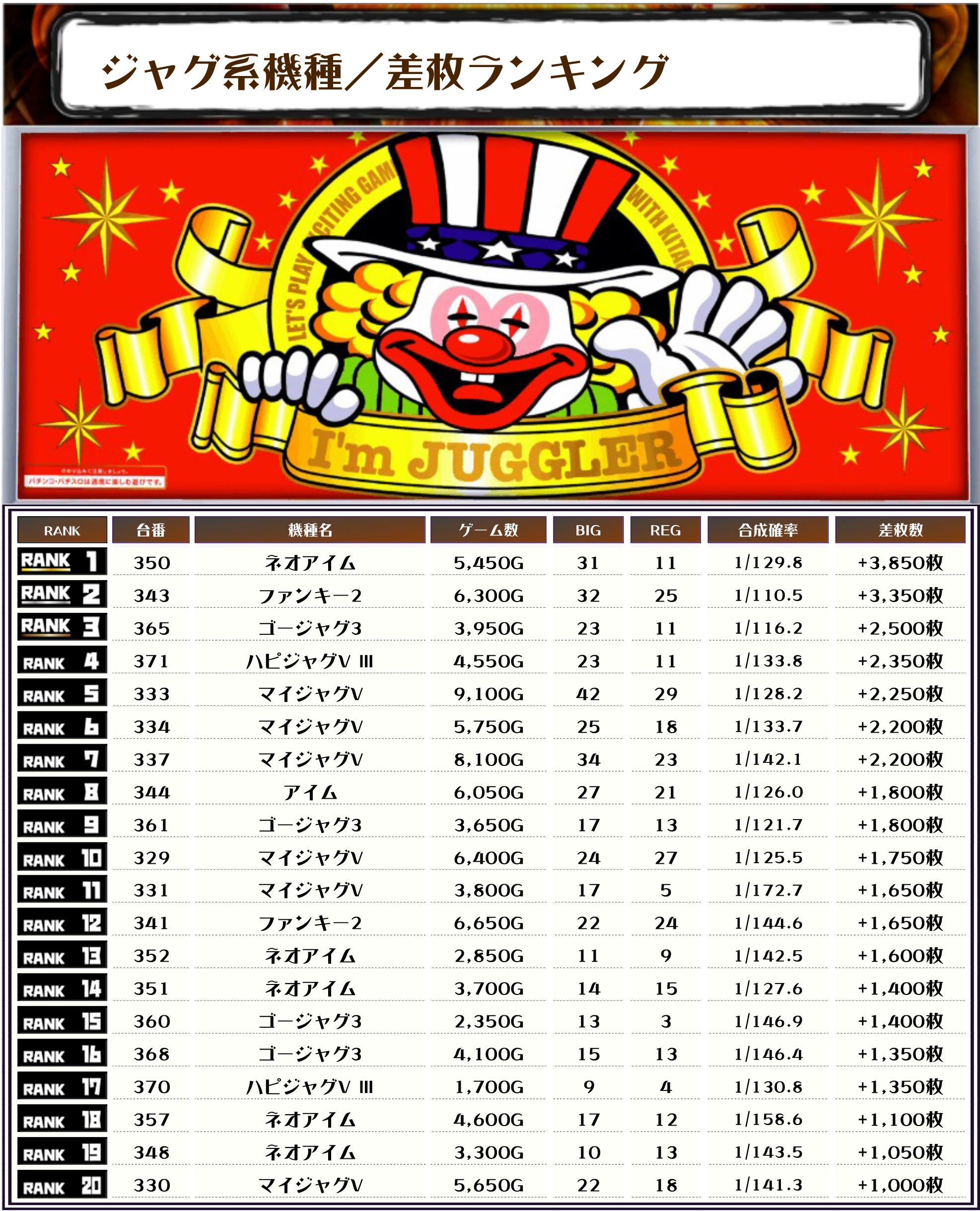 また、2位には【ファンキー2・343番台】の+3,350枚、そして3位には【ゴージャグ3・365番台】の+2,500枚がランクインしました🏆