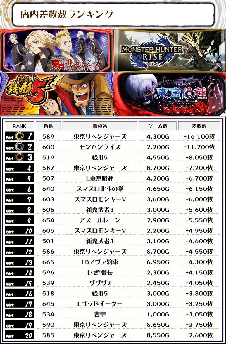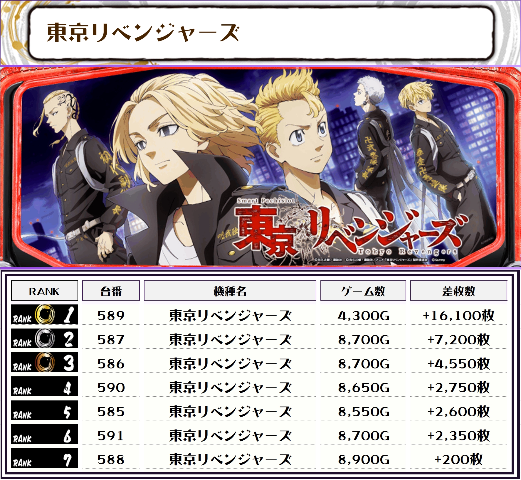 差枚ランキングでTOPに輝いたのは【東京リベンジャーズ・589番台】で+16,100枚‼️