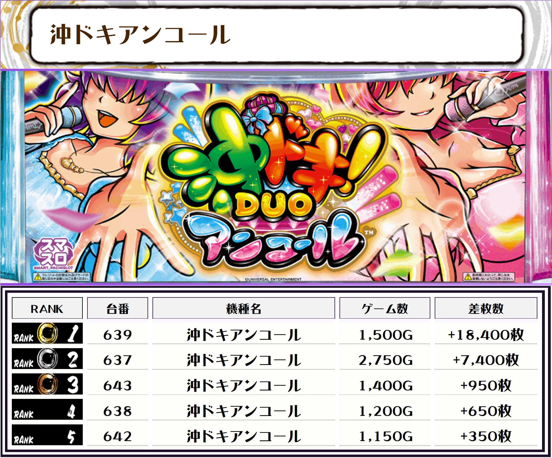 差枚ランキングでTOPに輝いたのは【沖ドキアンコール・639番台】で+18,400枚‼️