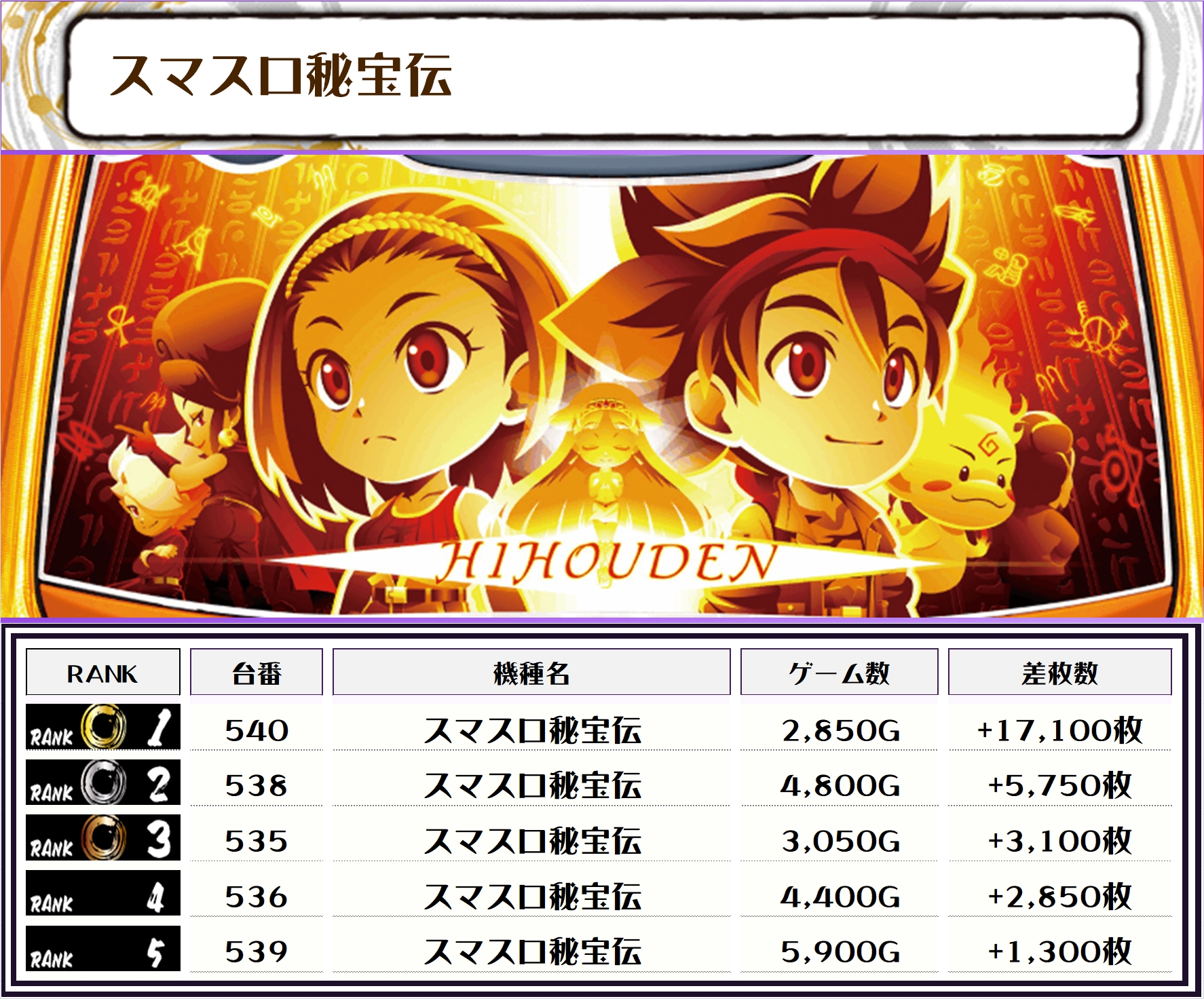 2位には【スマスロ秘宝伝・540番台】の+17,100枚、そして3位は【スマスロモンキーV・603番台】の+9,400枚がランクインしましたっ👾👾👾