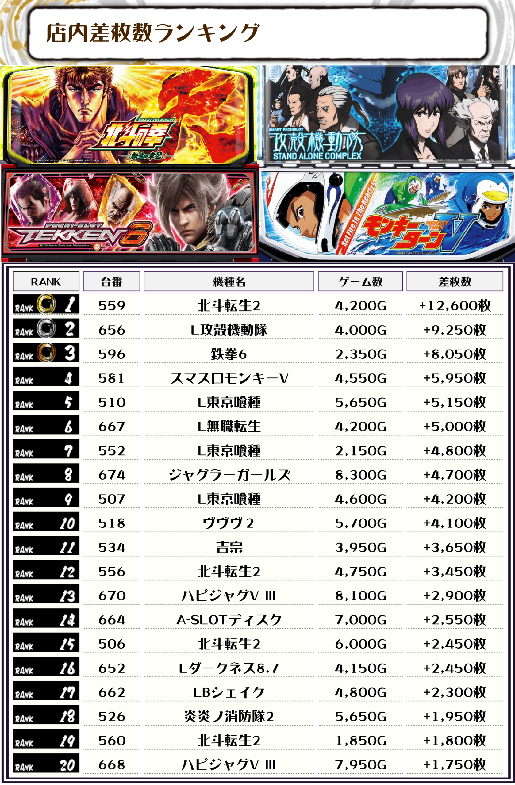 差枚ランキングでTOPに輝いたのは北斗転生2・559番台】で+12,600枚‼️