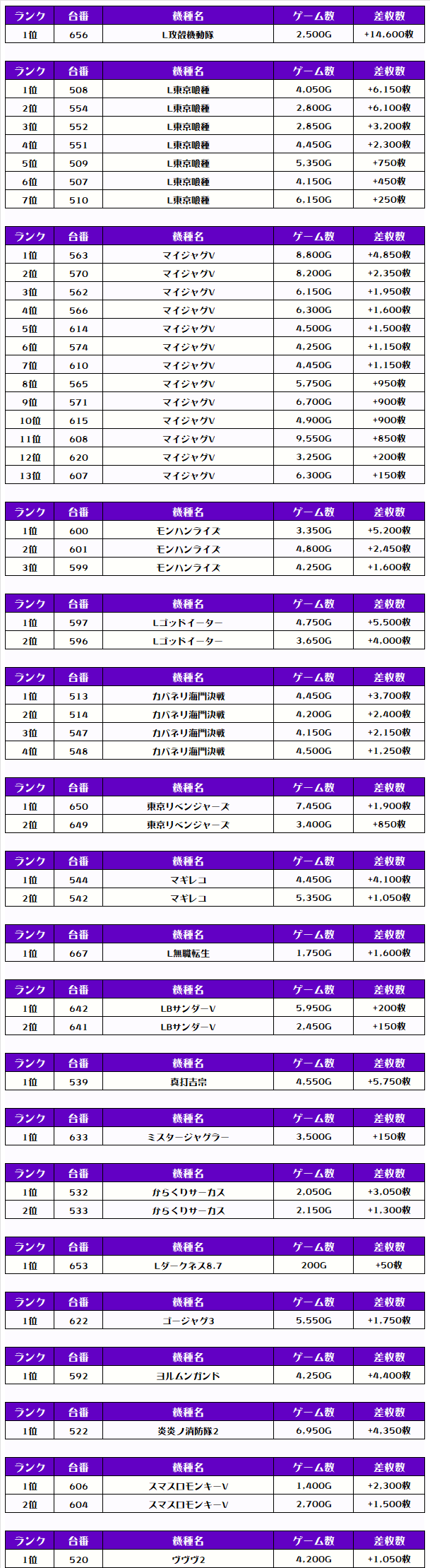 それでは、この日の機種別ランキングを見ていきましょう‼️