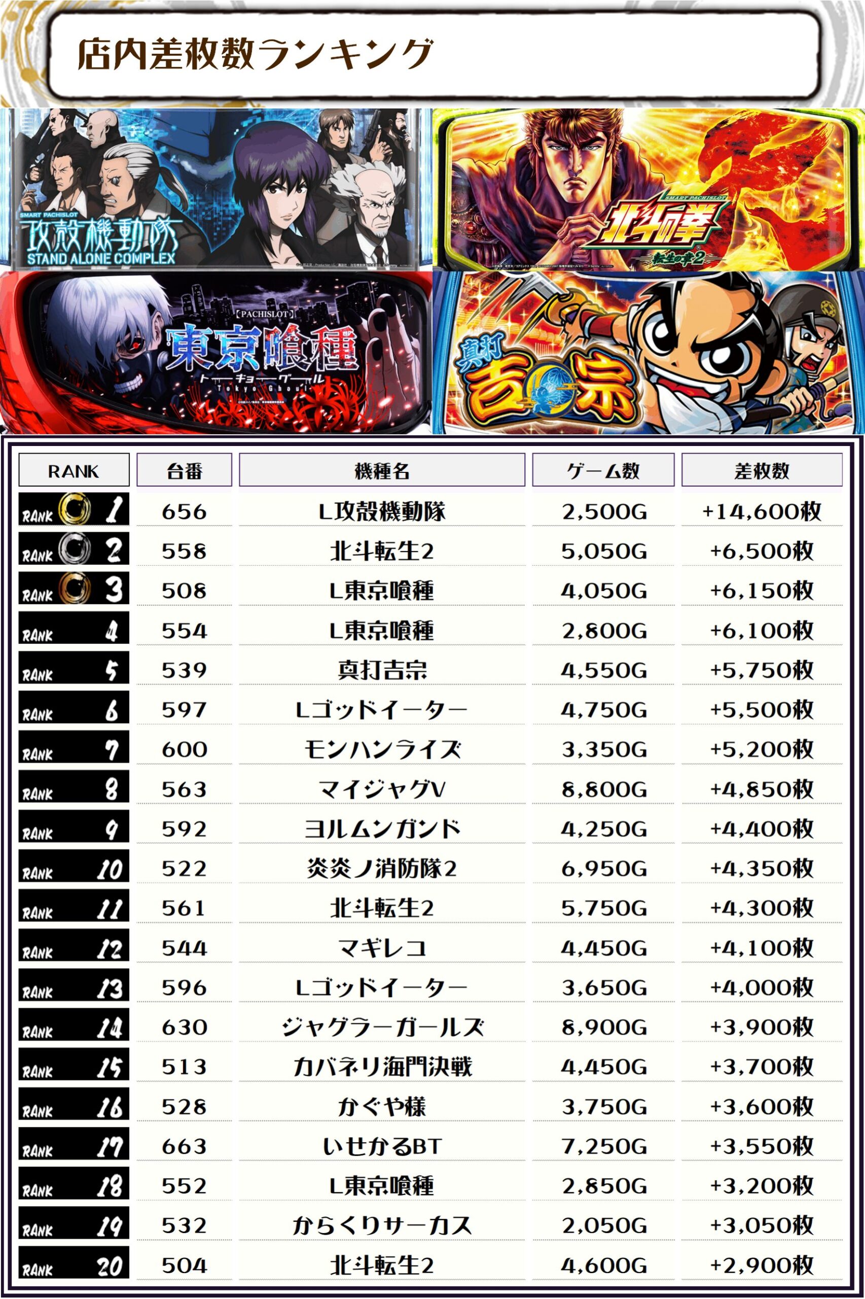 差枚ランキングでTOPに輝いたのは【L攻殻機動隊・656番台】で+14,600枚‼️