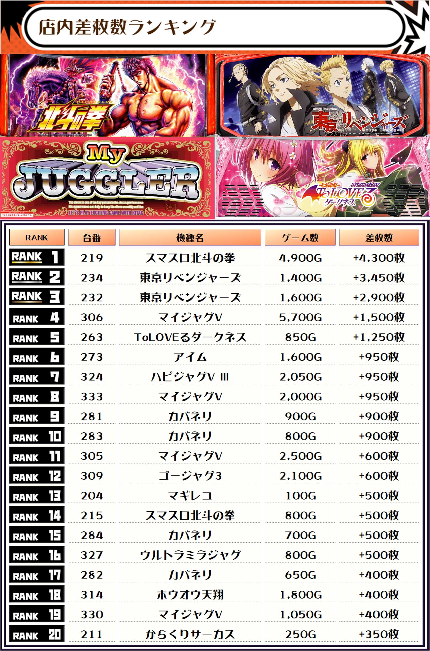 ということで、この日の店舗全体差枚数ランキングがコチラ🌟