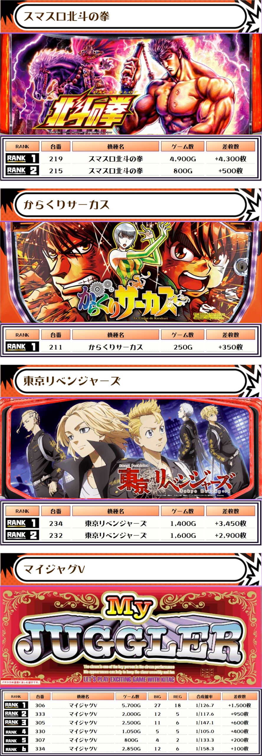 全体差枚のトップは【スマスロ北斗の拳・219番台】で+4,300枚っ👍