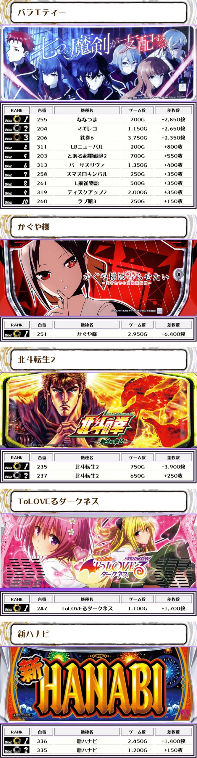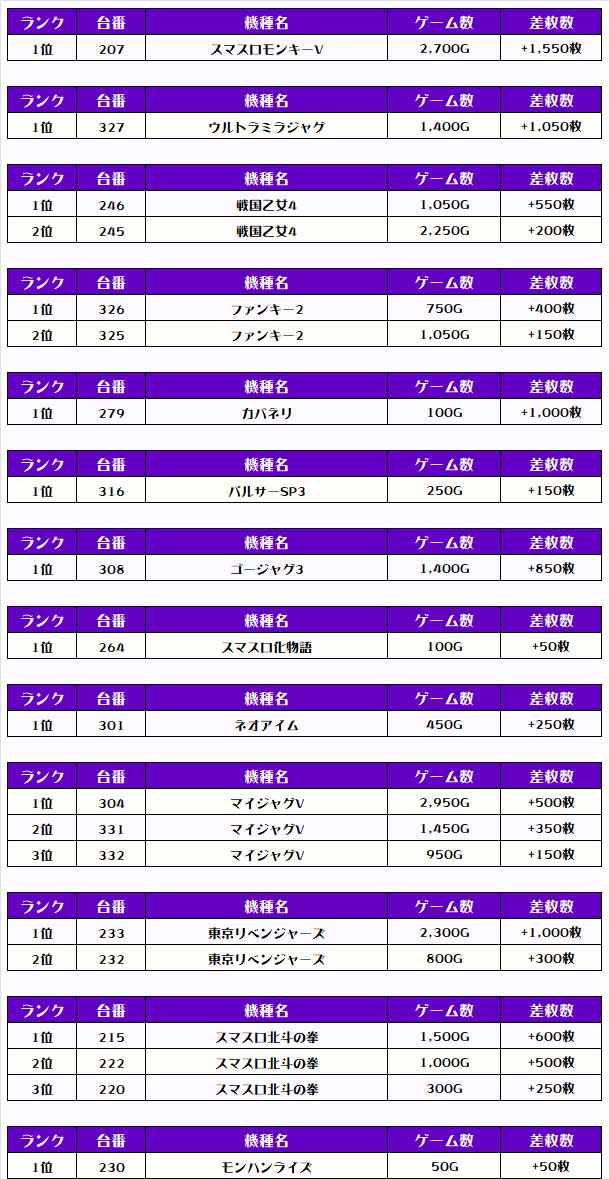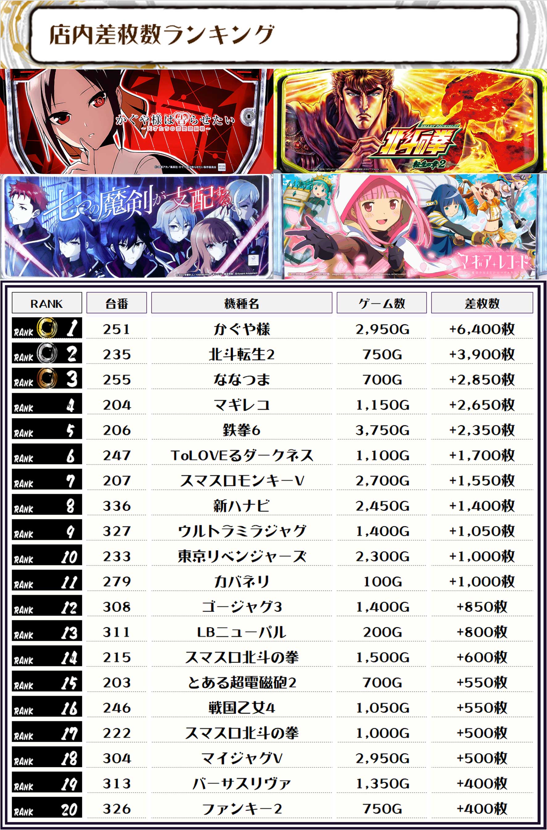 続く2位には【北斗転生2・235番台】の+3,900枚、そして3位には【ななつま・255番台】の+2,850枚がランクインですっ❗️