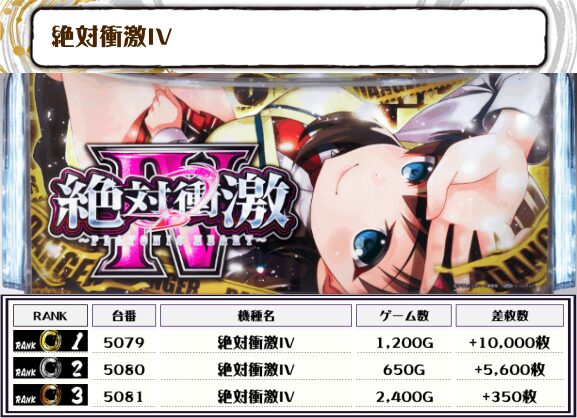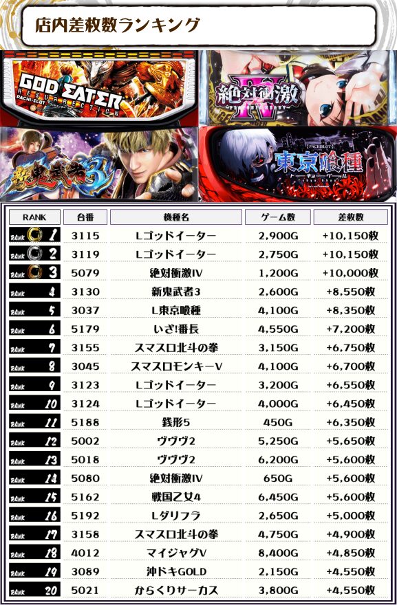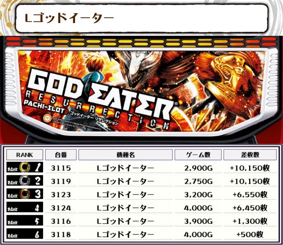2位にも同じく【Lゴッドイーター・3119番台】の+10,150枚、そして3位には【絶対衝激Ⅳ・5079番台】の+10,000枚がランクインっ🏆🏆🏆🏆