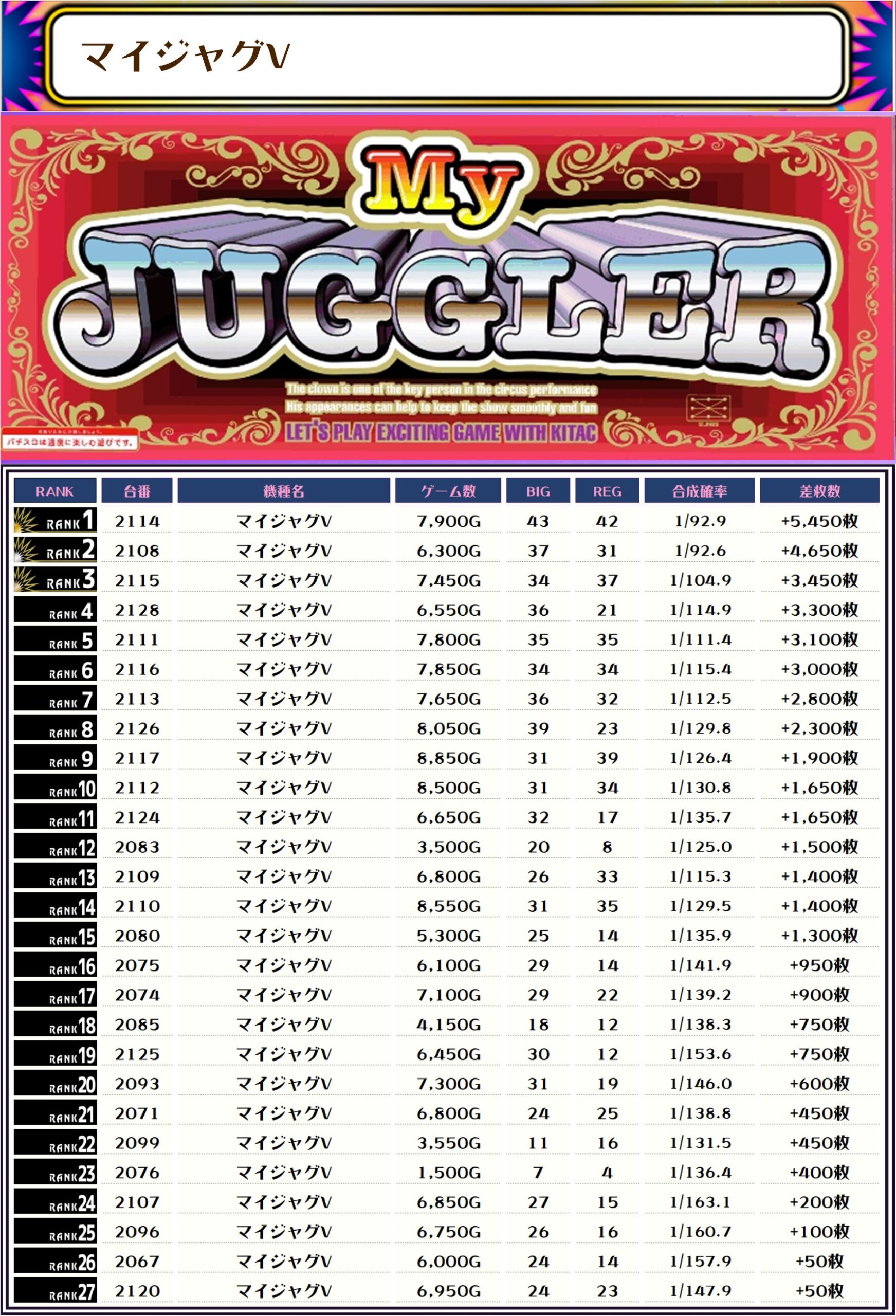 最後に、この日の店内差枚ランキングをどうぞっ❗️