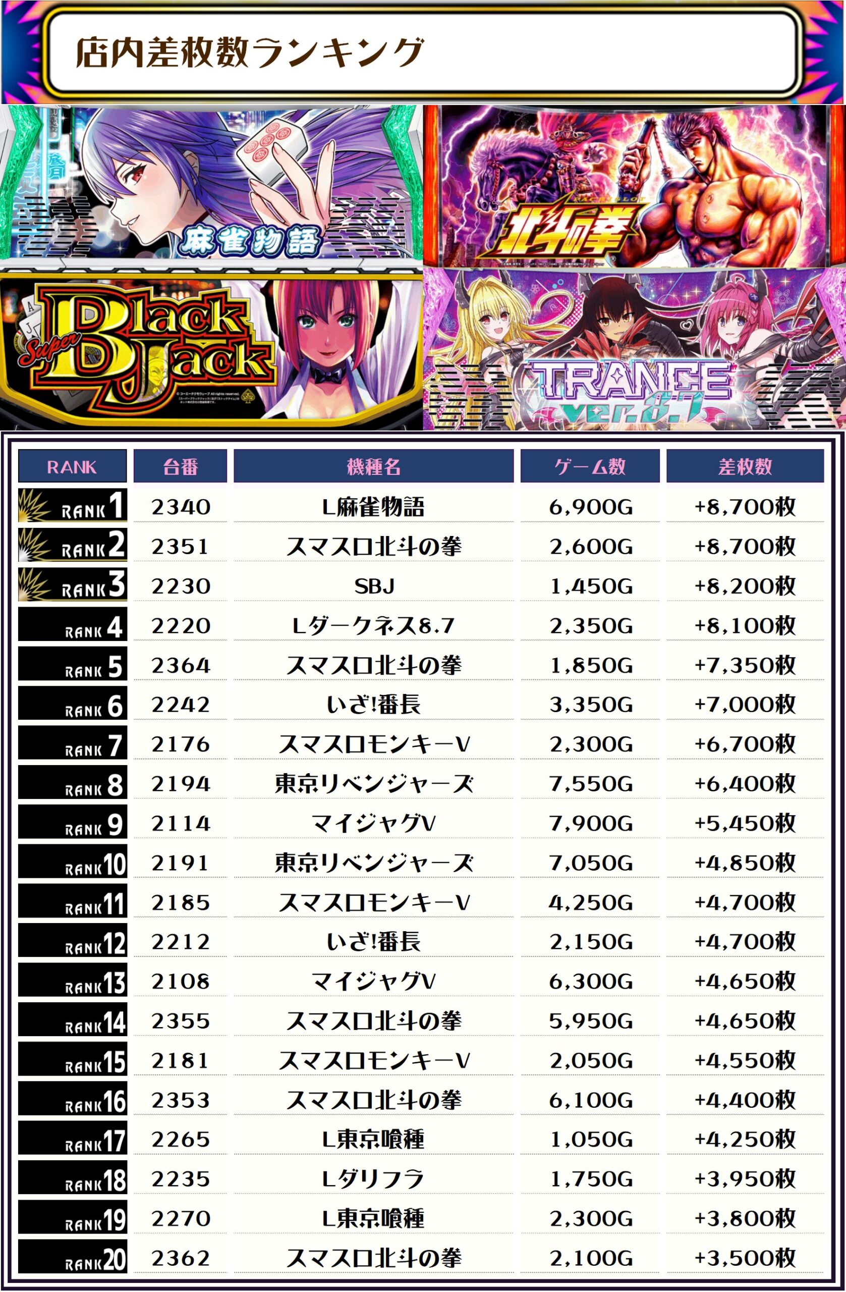 2位には【スマスロ北斗の拳・2351番台】の+8,700枚、そして3位は【SBJ・2230番台】の+8,200枚がランクインっ🏆🏆🏆🏆