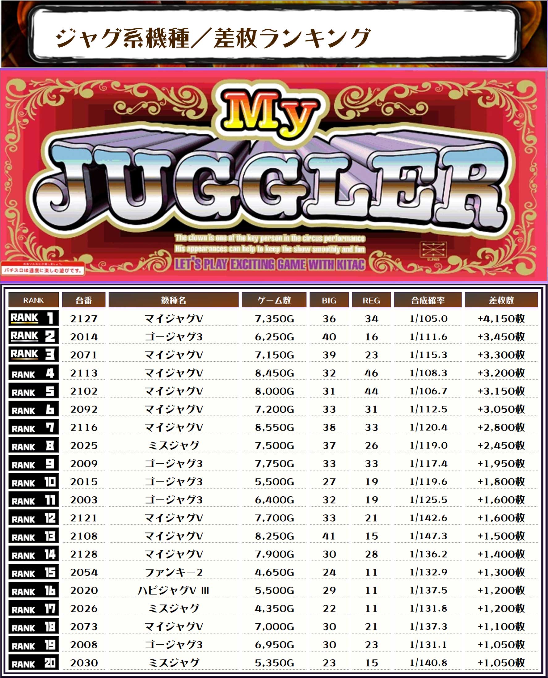 続く2位には【ゴージャグ3・2014番台】の+3,450枚、そして3位には【マイジャグV・2071番台】の+3,300枚がランクインっ👍