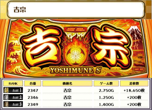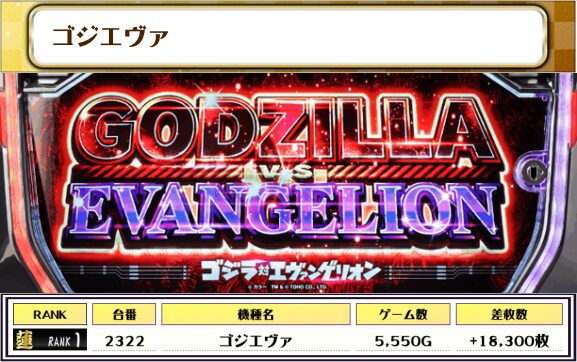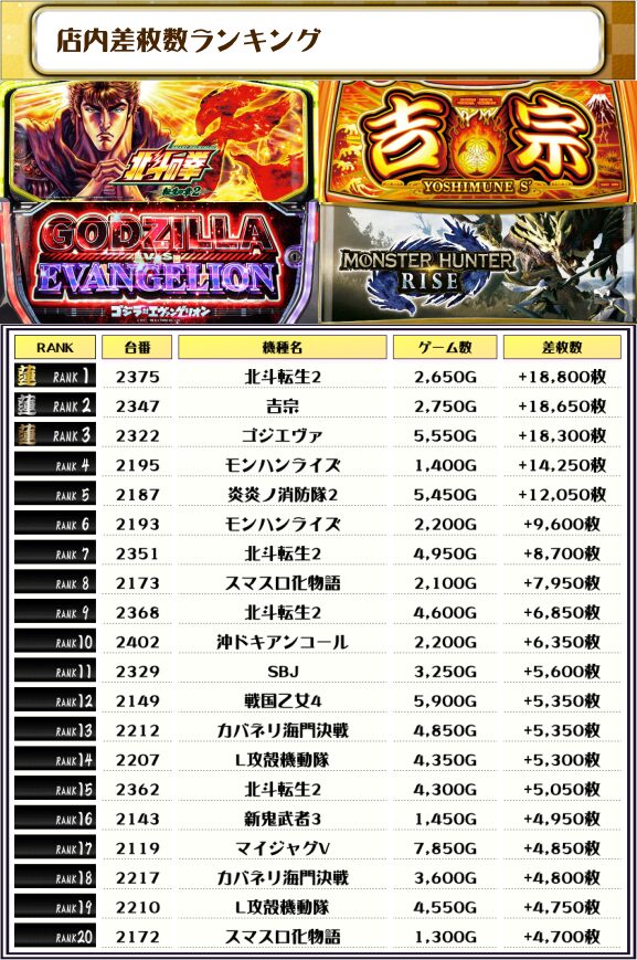 2位も【吉宗・2347番台】の+18,650枚、そして3位は【ゴジエヴァ・2322番台】の+18,300枚がランクインっ🏆🏆🏆🏆