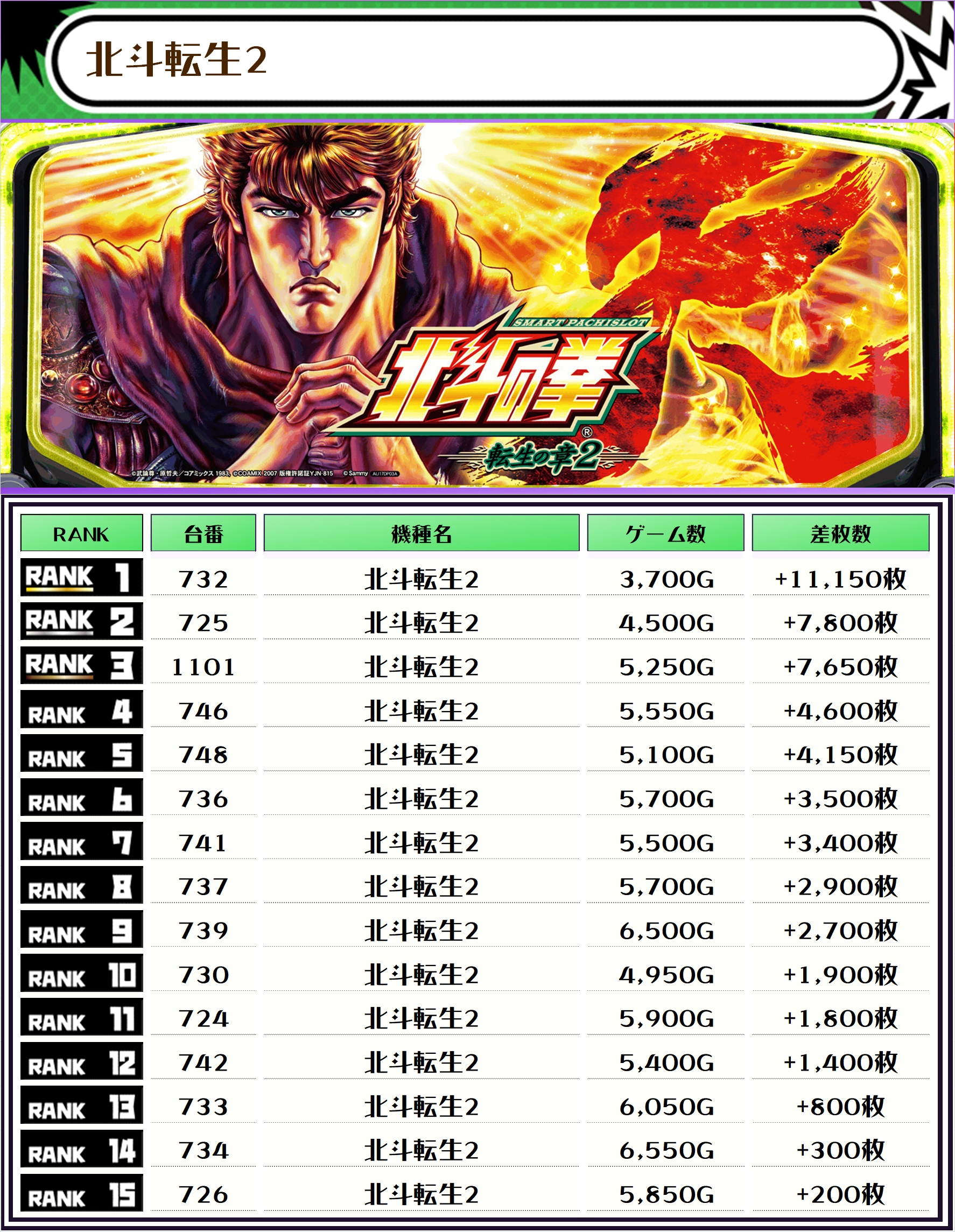2位は【L東京喰種・2251番台】の+7,450枚、そして3位は【北斗転生2・2357番台】の+6,200枚がランクインっ🏆🏆🏆🏆