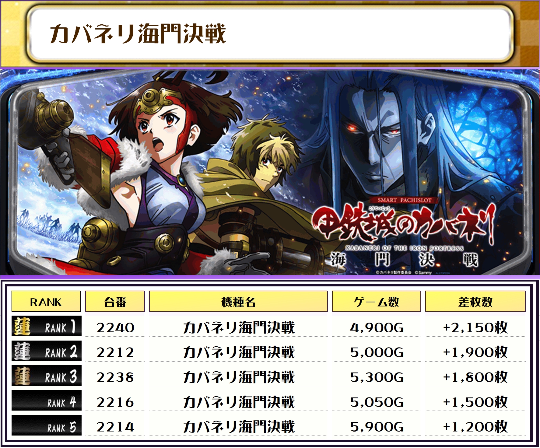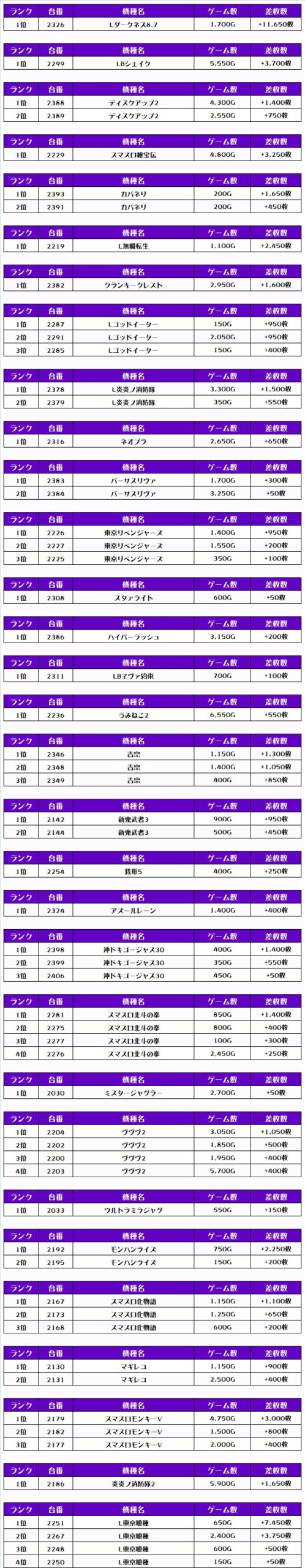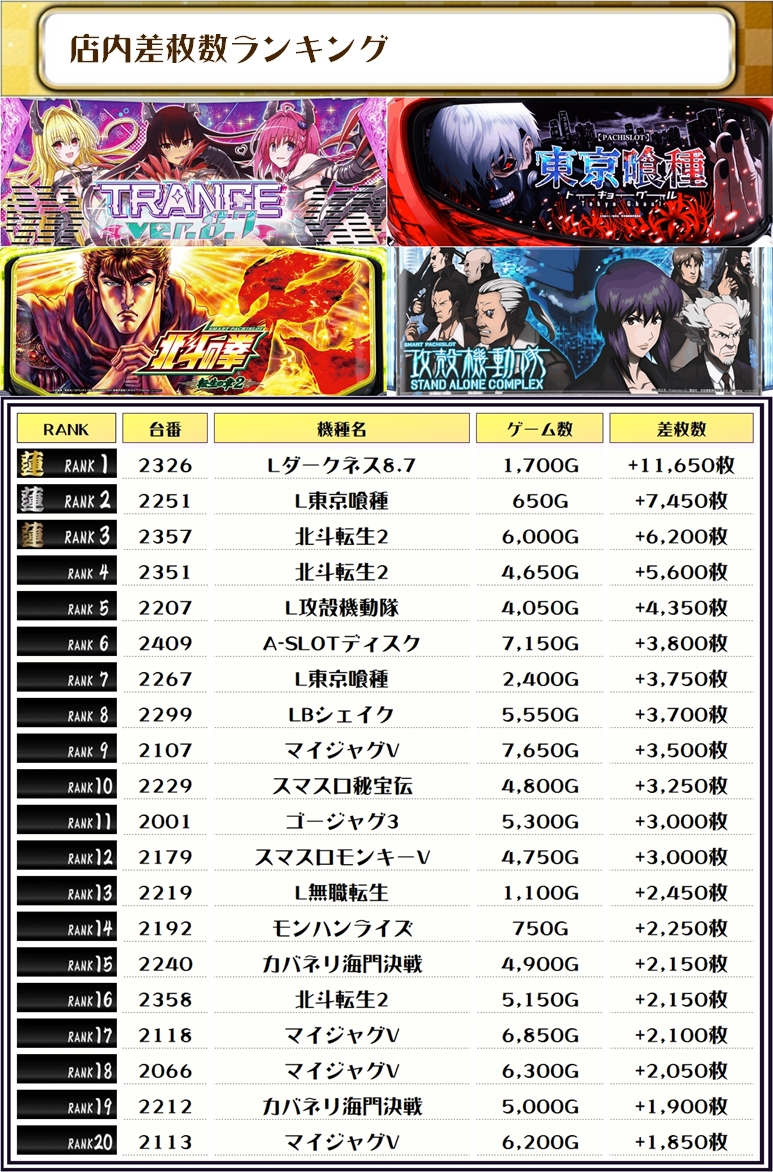 2位は【L東京喰種・2251番台】の+7,450枚、そして3位は【北斗転生2・2357番台】の+6,200枚がランクインっ🏆🏆🏆🏆