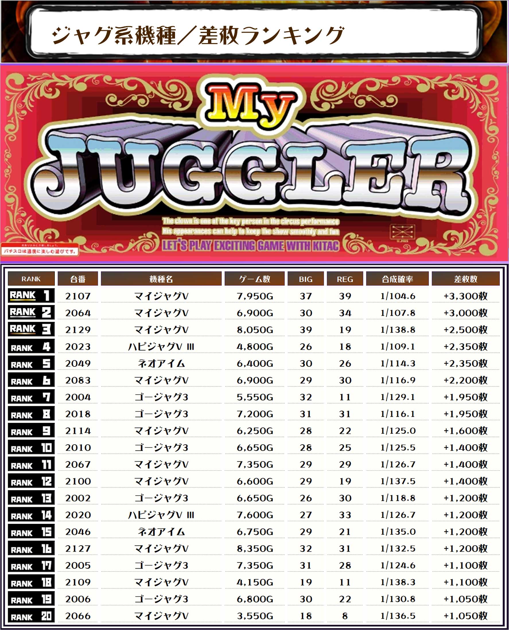 ということで、この日のトップ差枚は【マイジャグV・2107番台】で+3,300枚🤡✨
