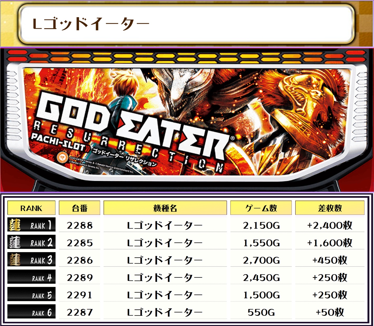先述した北斗転生2のほか、人気のカバネリ海門やゴッドイーターのシマから、優秀台が多く出現しましたね✨