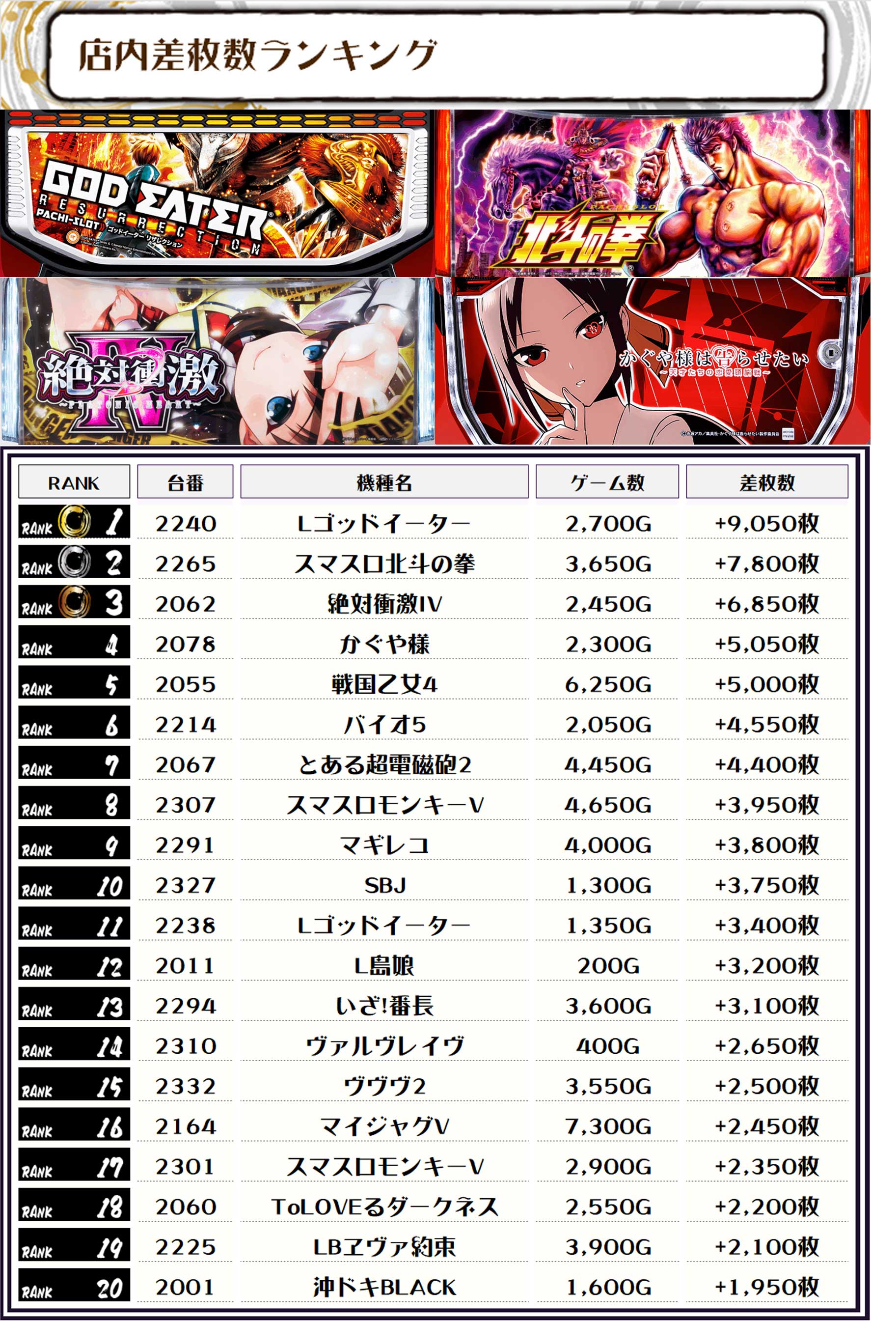 この日、全体の差枚トップに輝いたのは【Lゴッドイーター・2240番台】で+9,050枚‼️