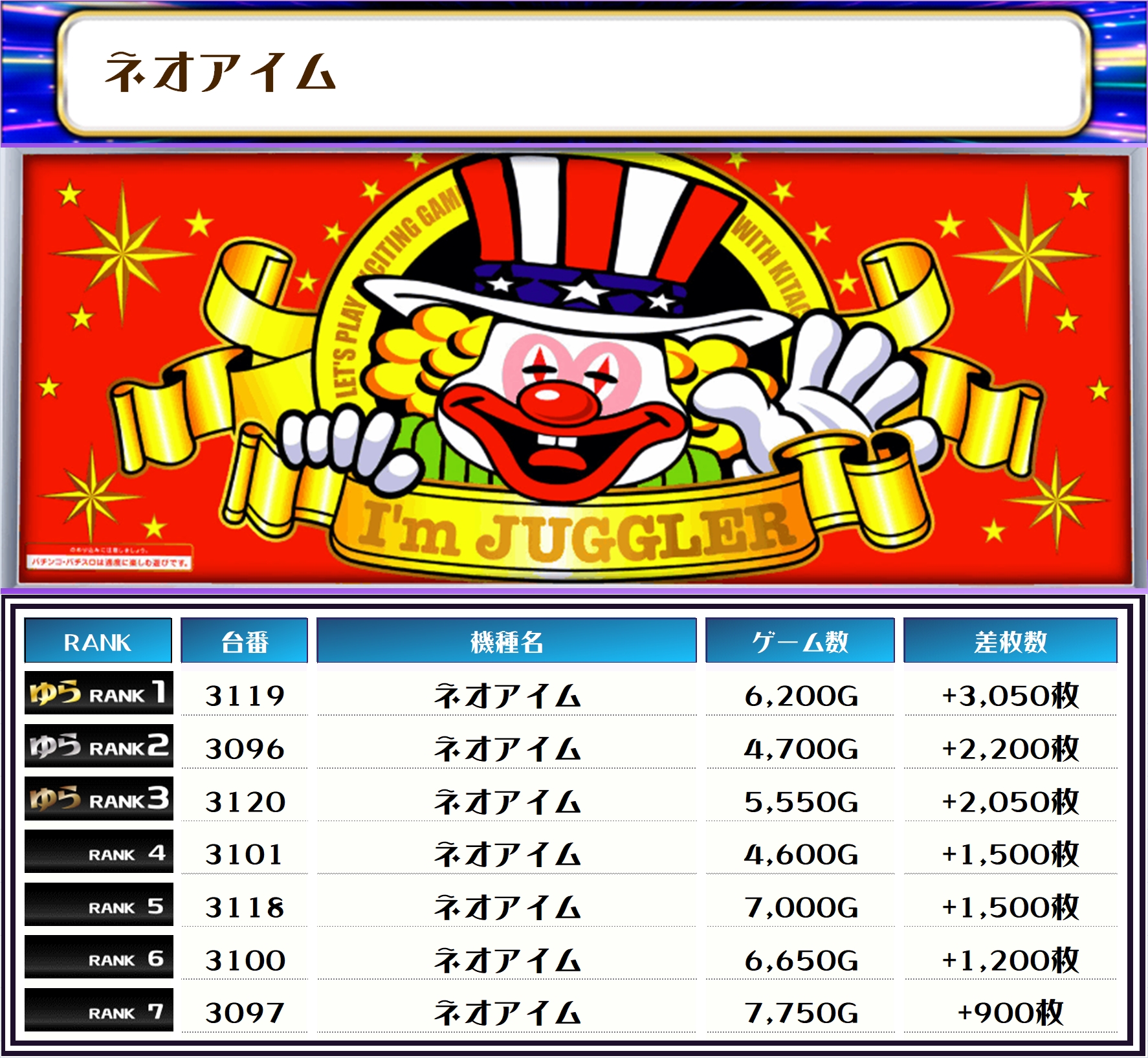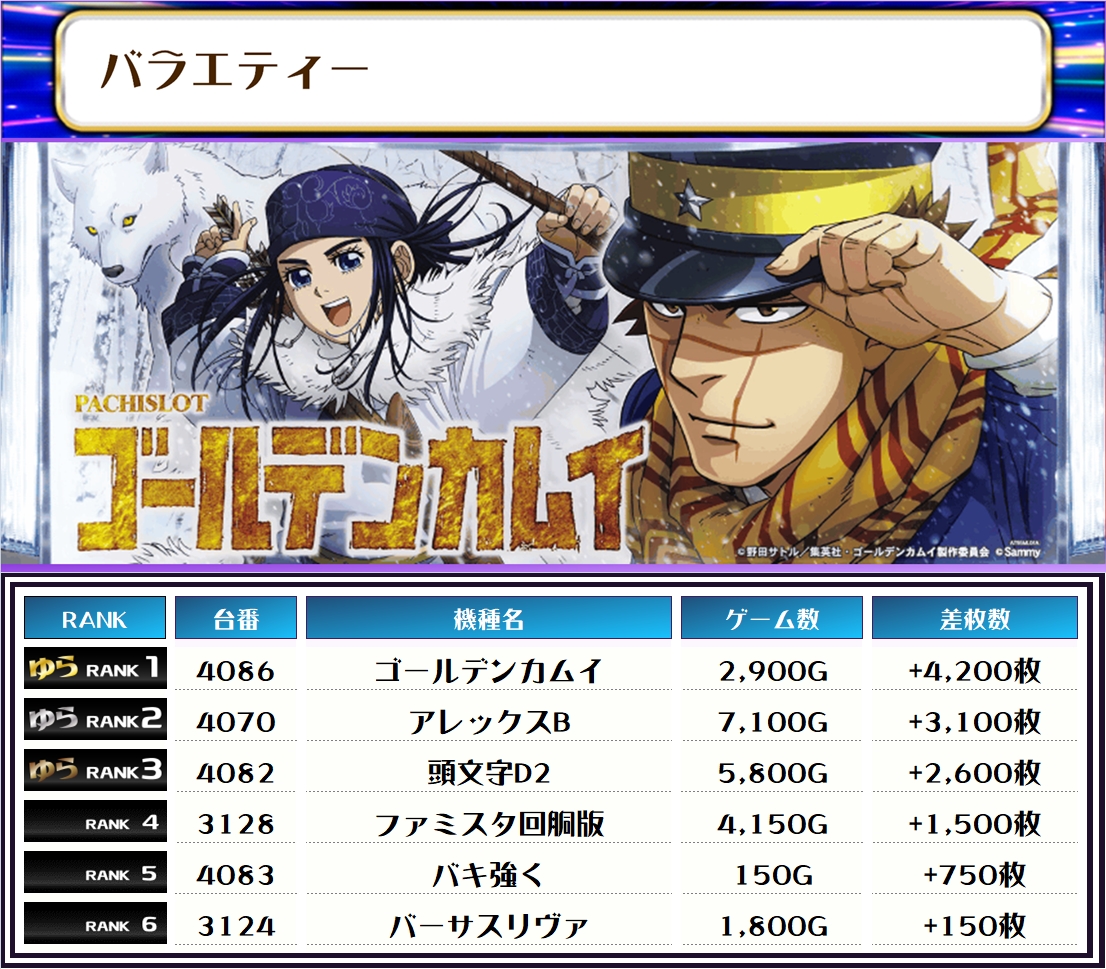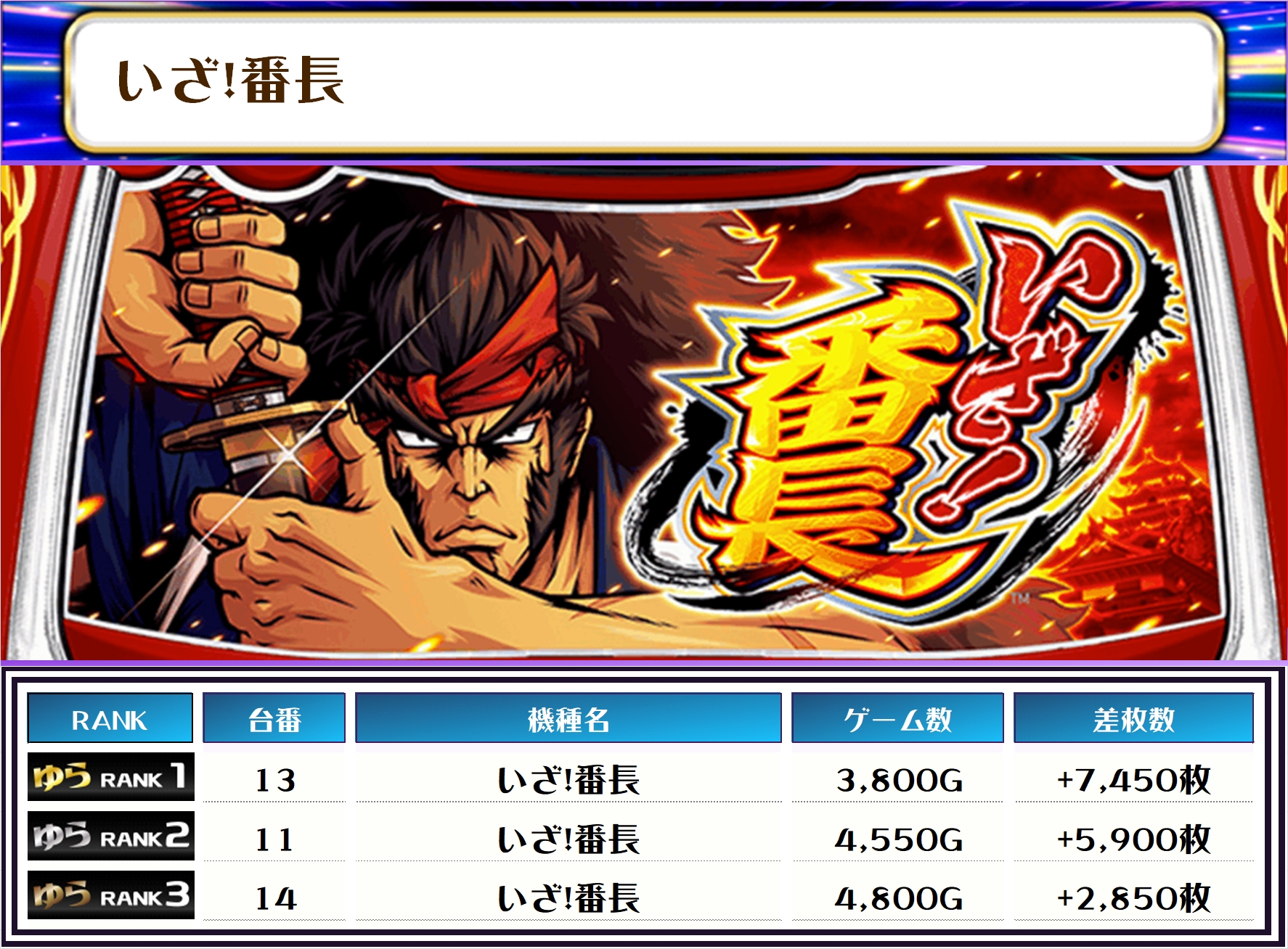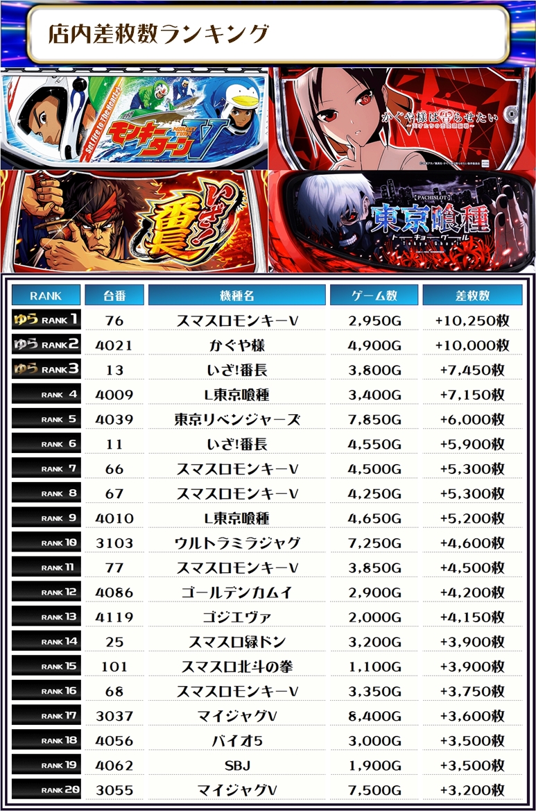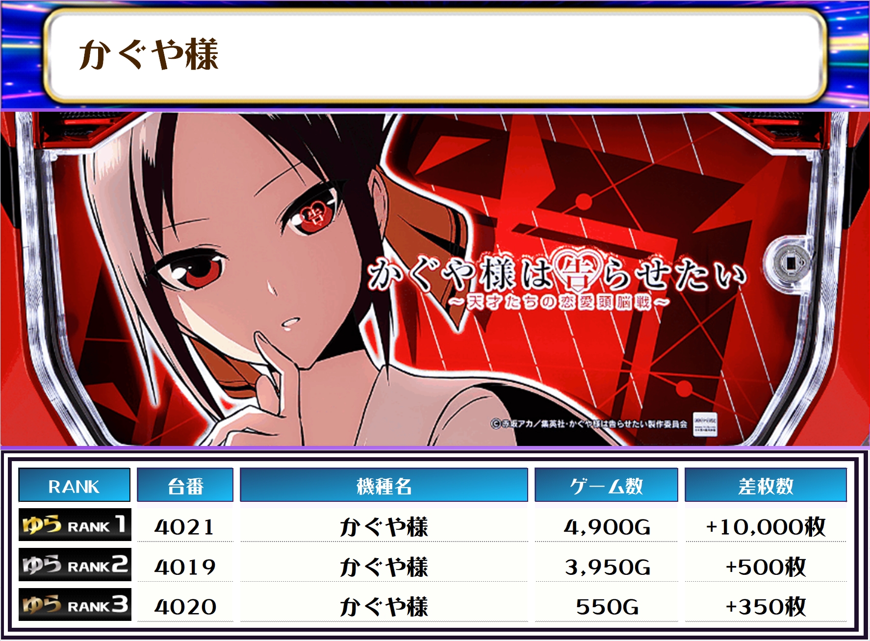 続く2位には【かぐや様・4021番台】の+10,000枚、そして3位には【いざ!番長・13番台】の+7,450枚がランクインっ🏆🏆🏆