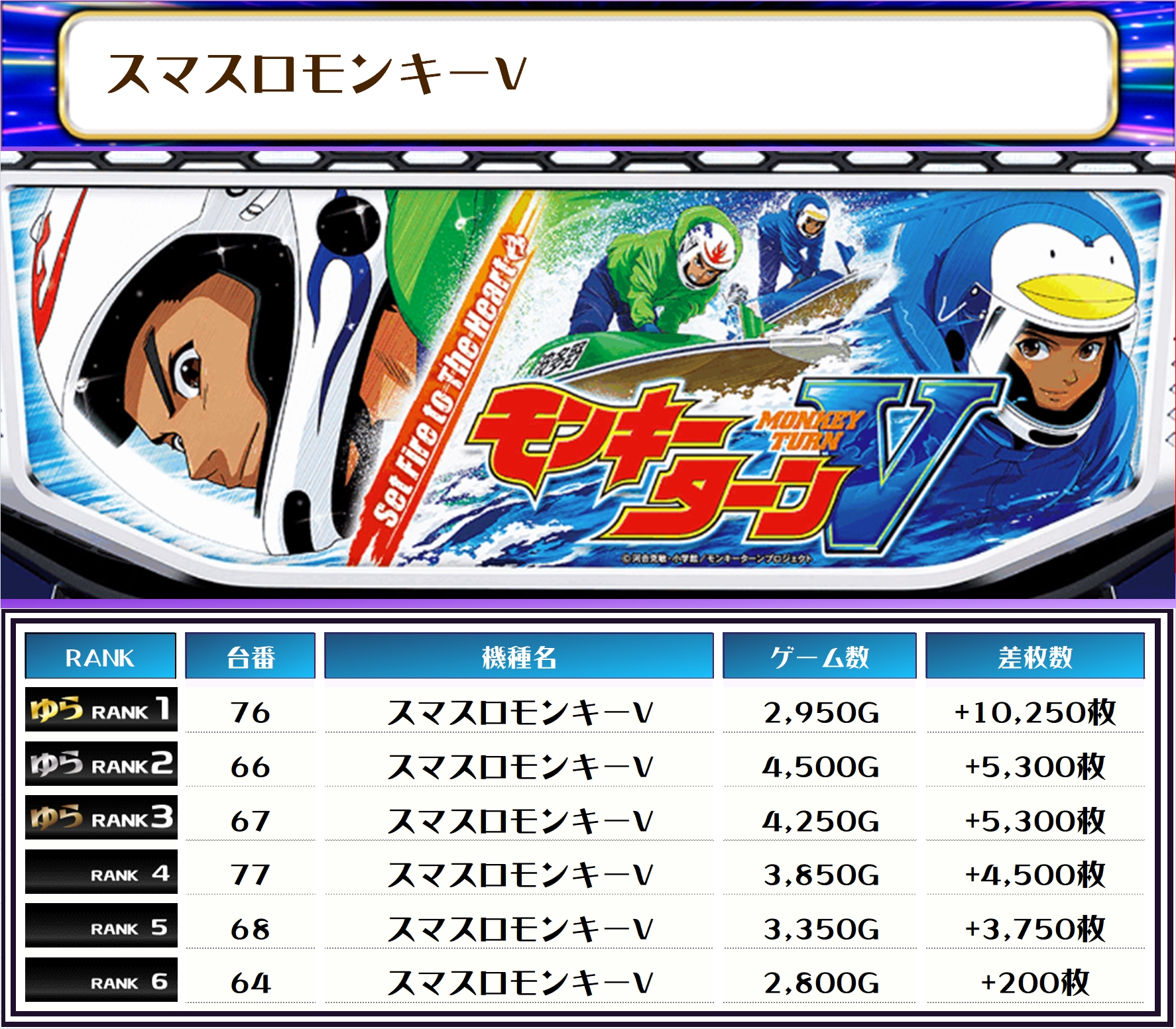 全体のTOP差枚は【スマスロモンキーV・76番台】で+10,250枚🏆🏆🏆