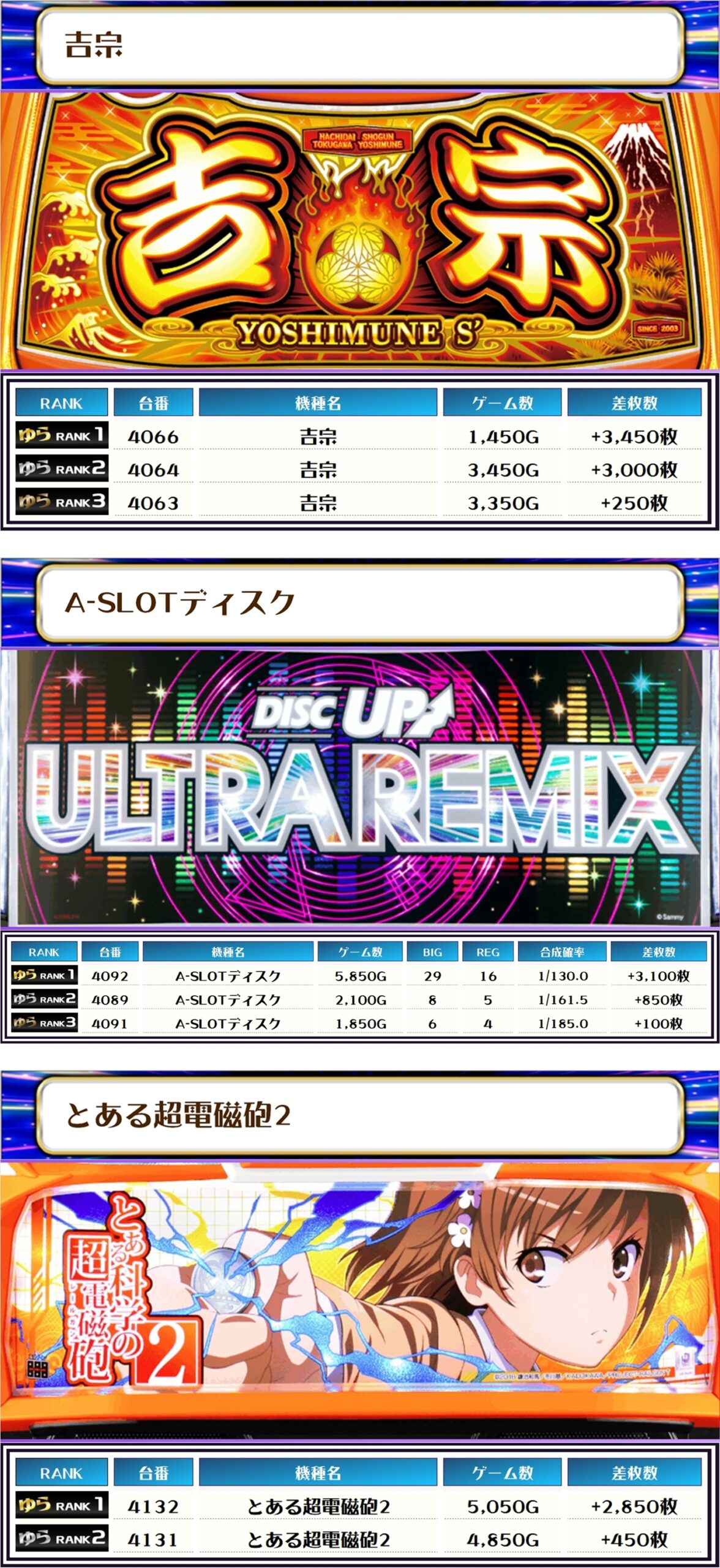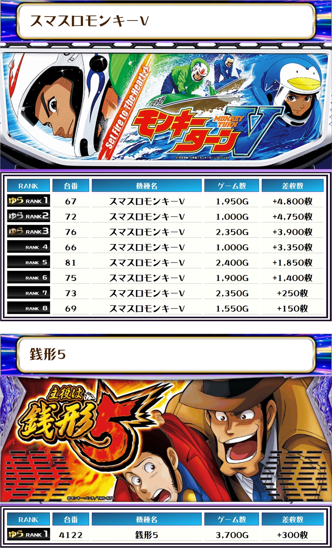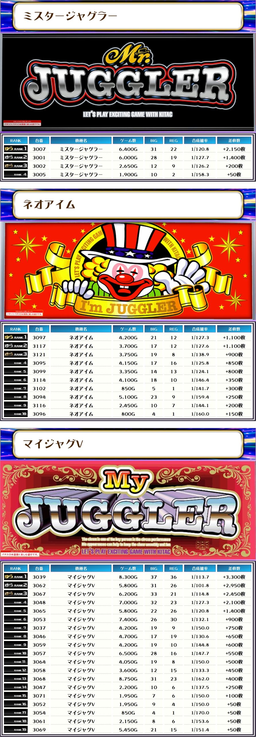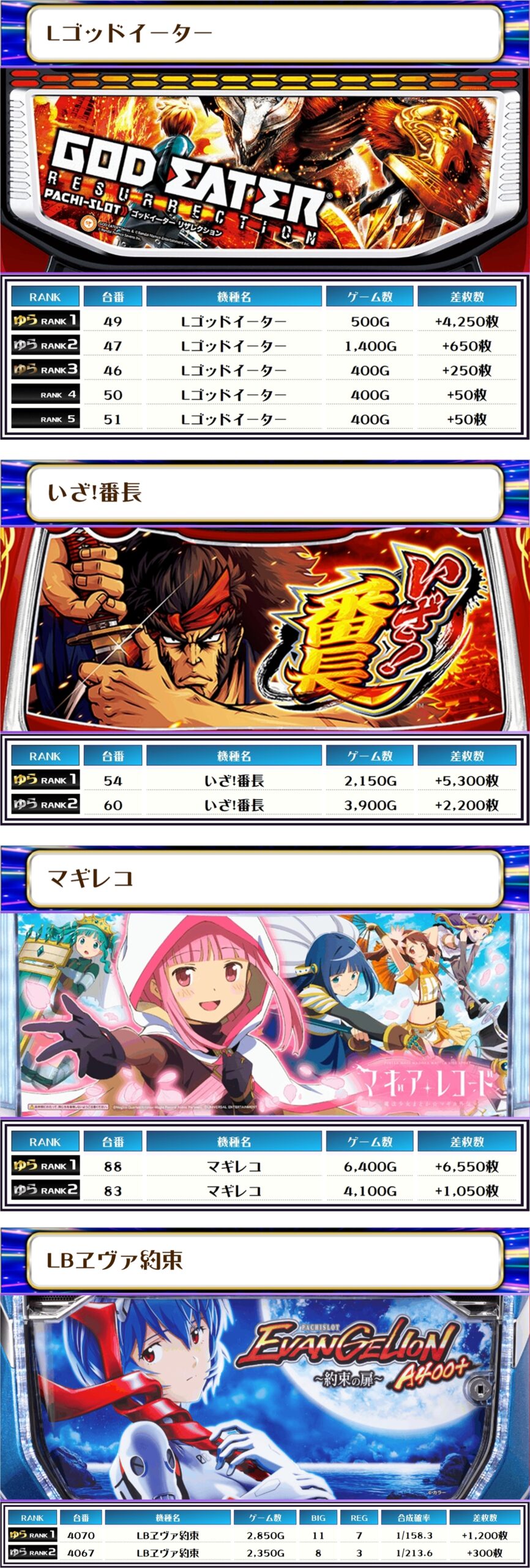 ランキングに、2機種合わせて9台も入賞を果たし、全部だったのでは?と思ってしまうくらい優秀台があちこちに出現いたしました~✨