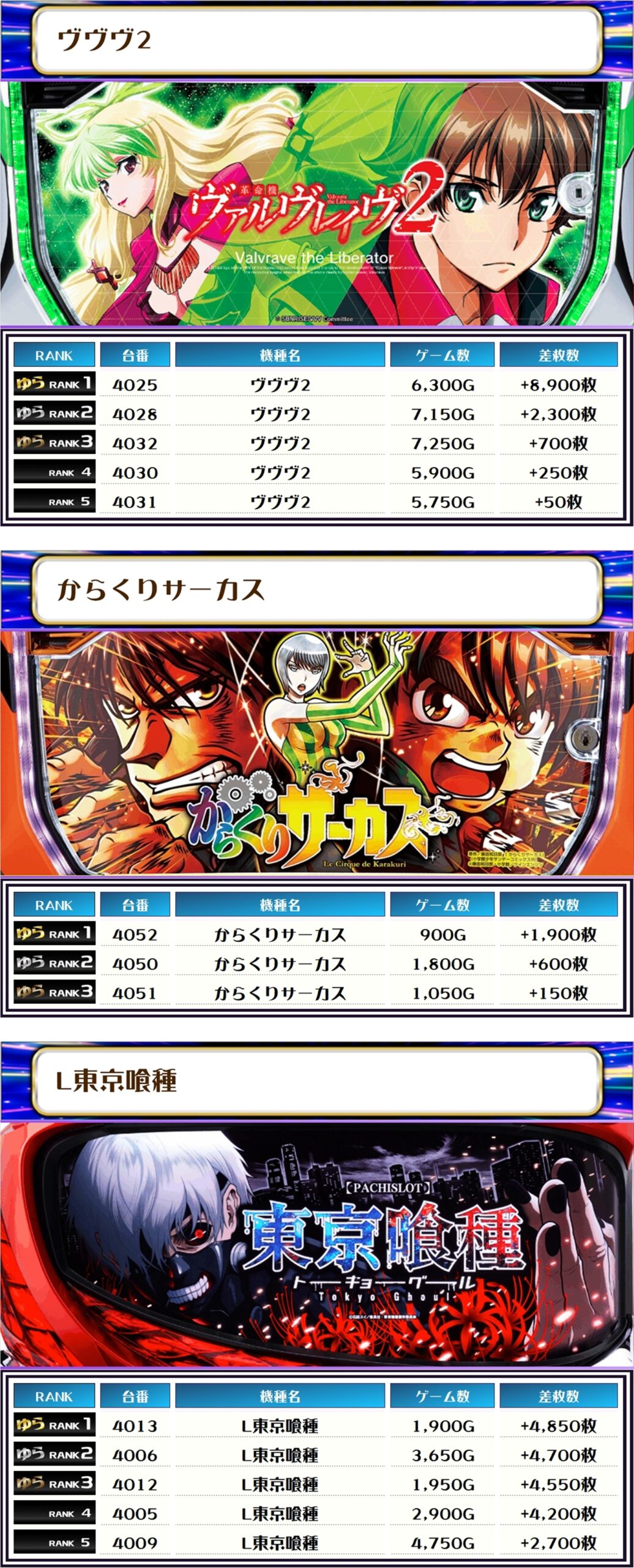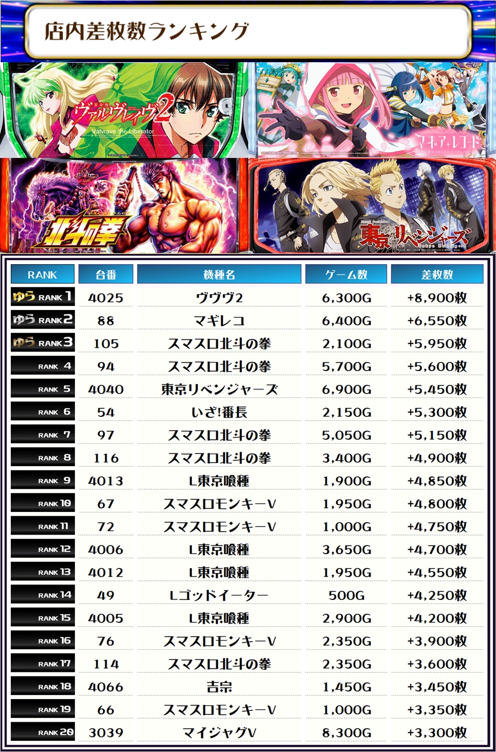 全体のTOP差枚は新台の【ヴヴヴ2・4025番台】で+8,900枚👍