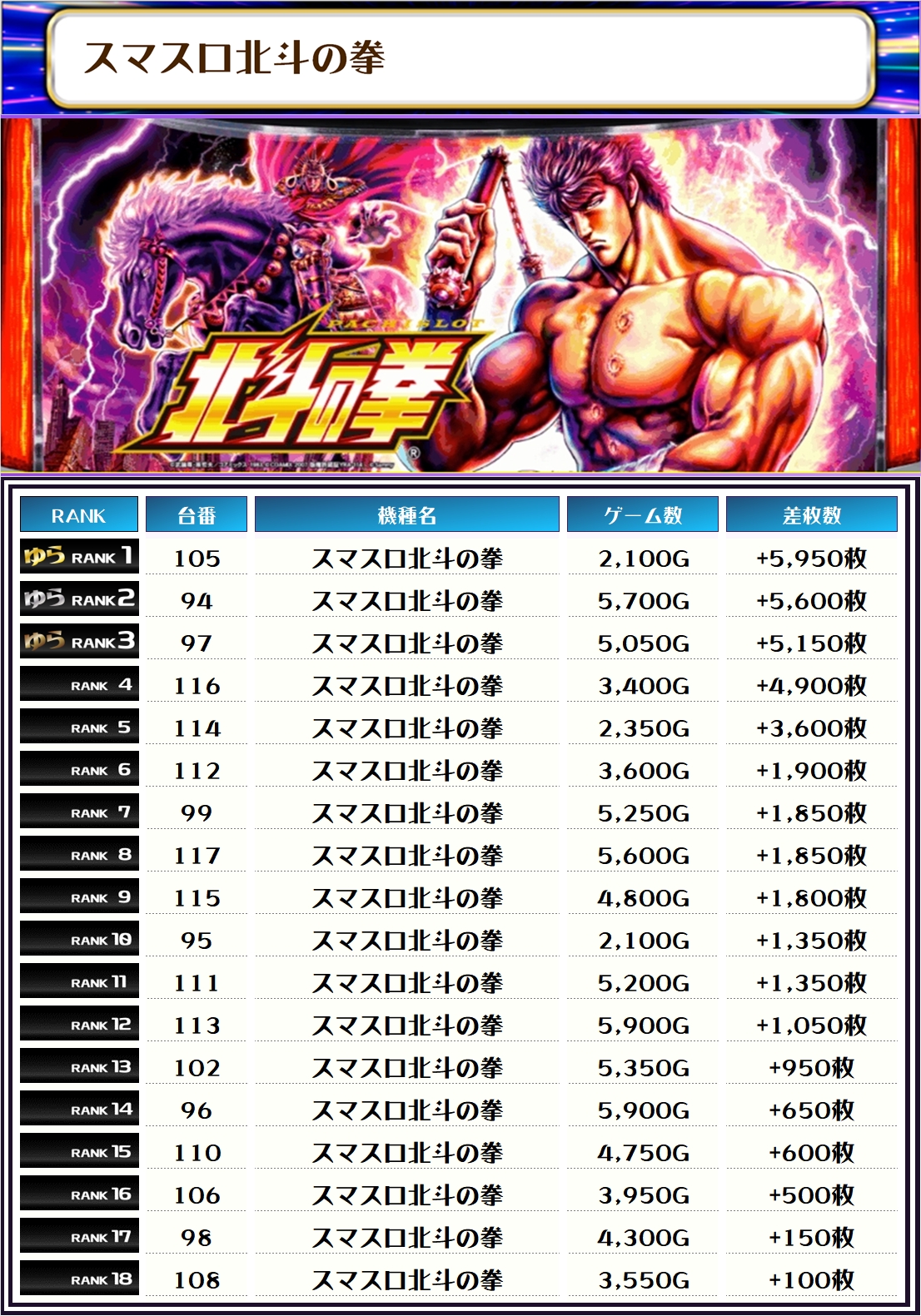 続く2位には【マギレコ・88番台】の+6,550枚、そして3位には【スマスロ北斗の拳・105番台】の+5,960枚がランクインっ🏆🏆🏆