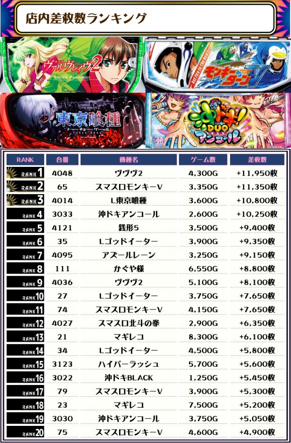 続く2位には【スマスロモンキーV・65番台】の+11,350枚、そして3位には【L東京喰種・4014番台】の+10,800枚がランクインっ🏆🏆🏆