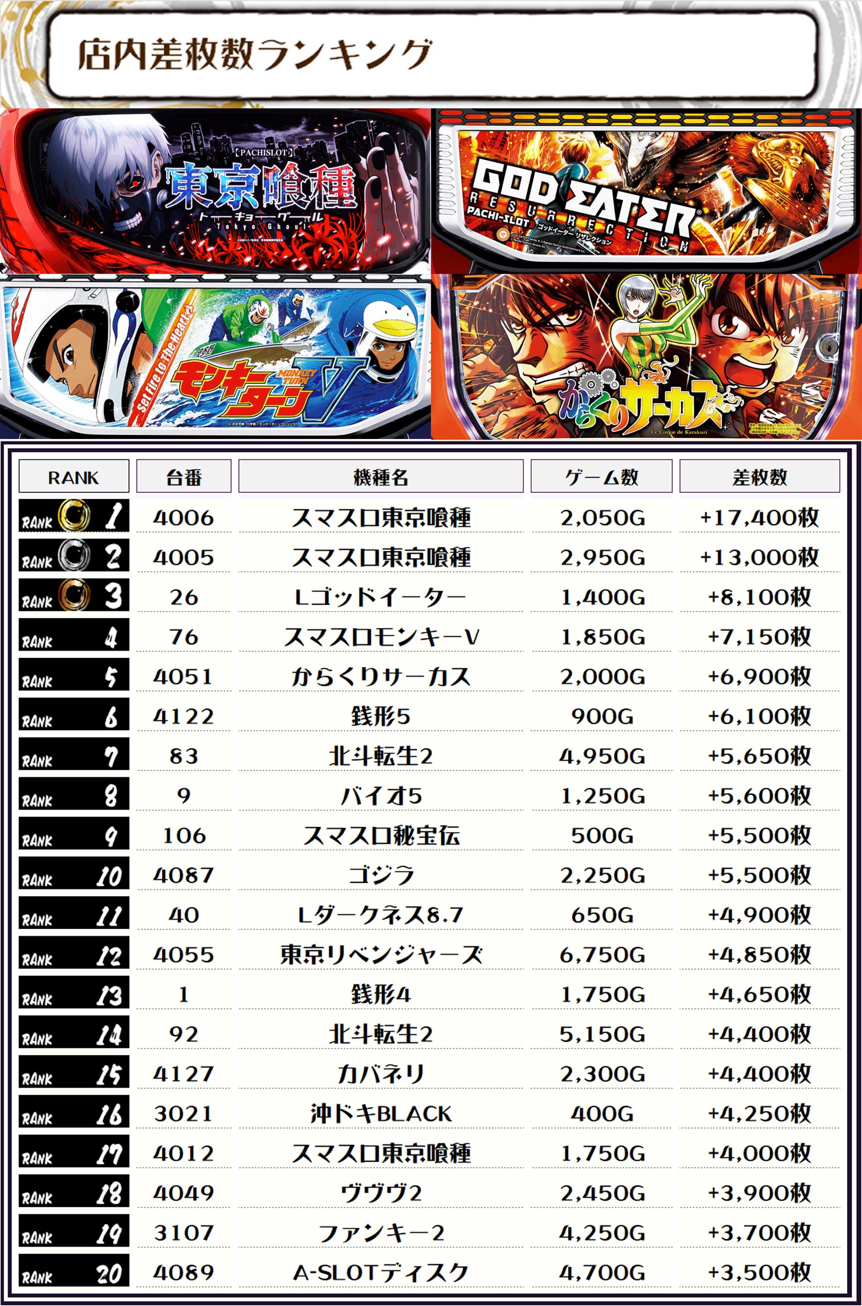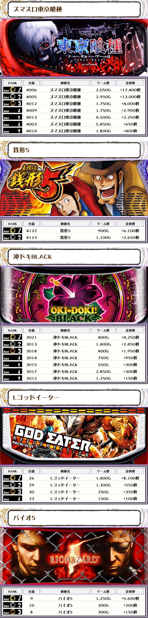 2位には【スマスロ東京喰種・4005番台】の+13,000枚、そして3位には【Lゴッドイーター・26番台】の+8,100枚がランクインっ🏆🏆🏆🏆