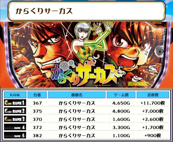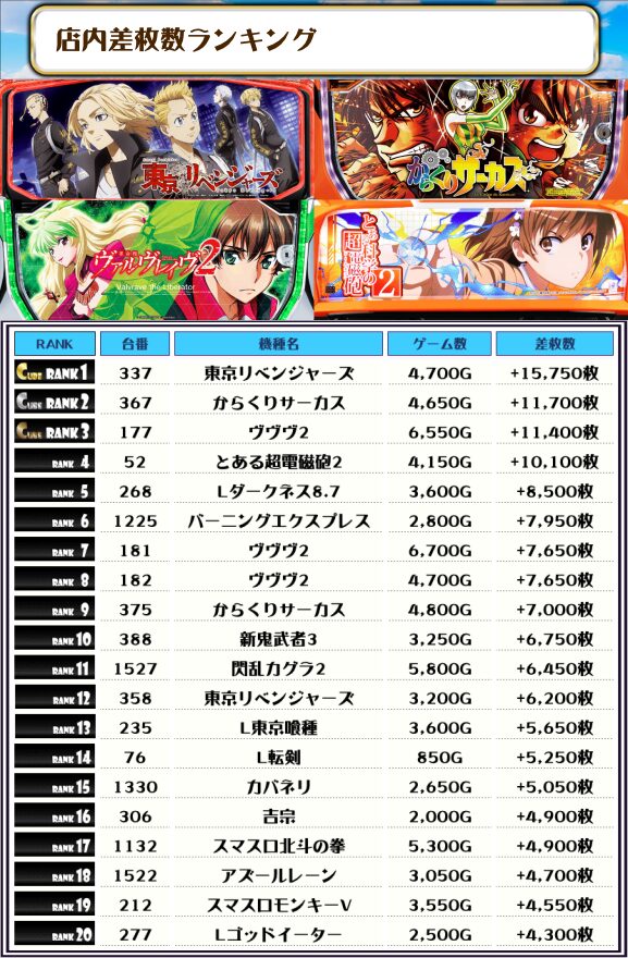 2位には【からくりサーカス・367番台】の+11,700枚、3位には【ヴヴヴ2・177番台】の+11,400枚がランクインっ🏆🏆🏆🏆