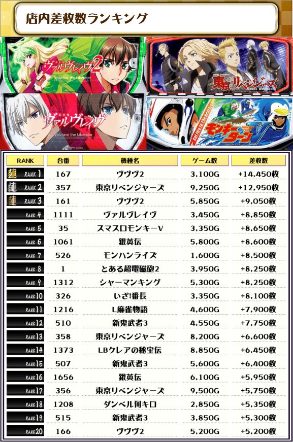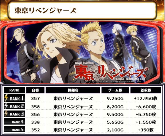 2位には【東京リベンジャーズ・357番台】の+12,950枚、3位には【ヴヴヴ2・161番台】の+9,050枚がランクインっ🏆🏆🏆🏆