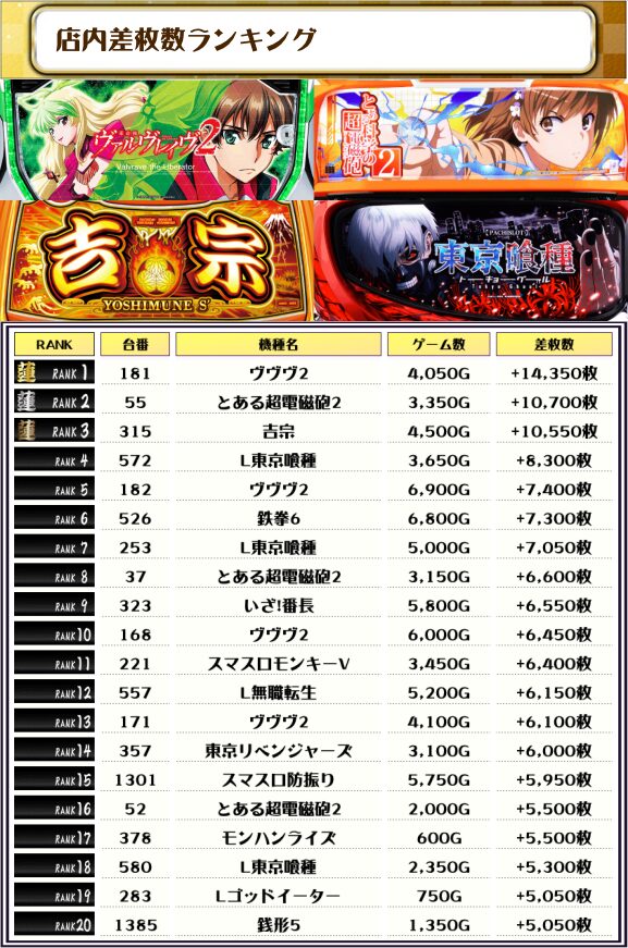 最後に、この日の店内差枚ランキングをご覧ください❗️
