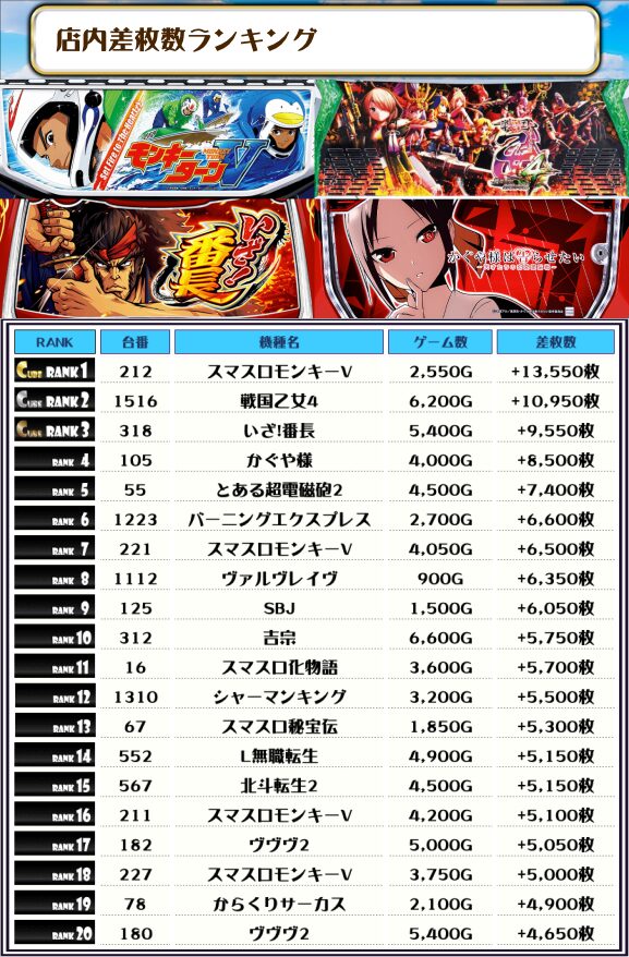 最後に、この日の店内差枚ランキングをご覧ください❗️