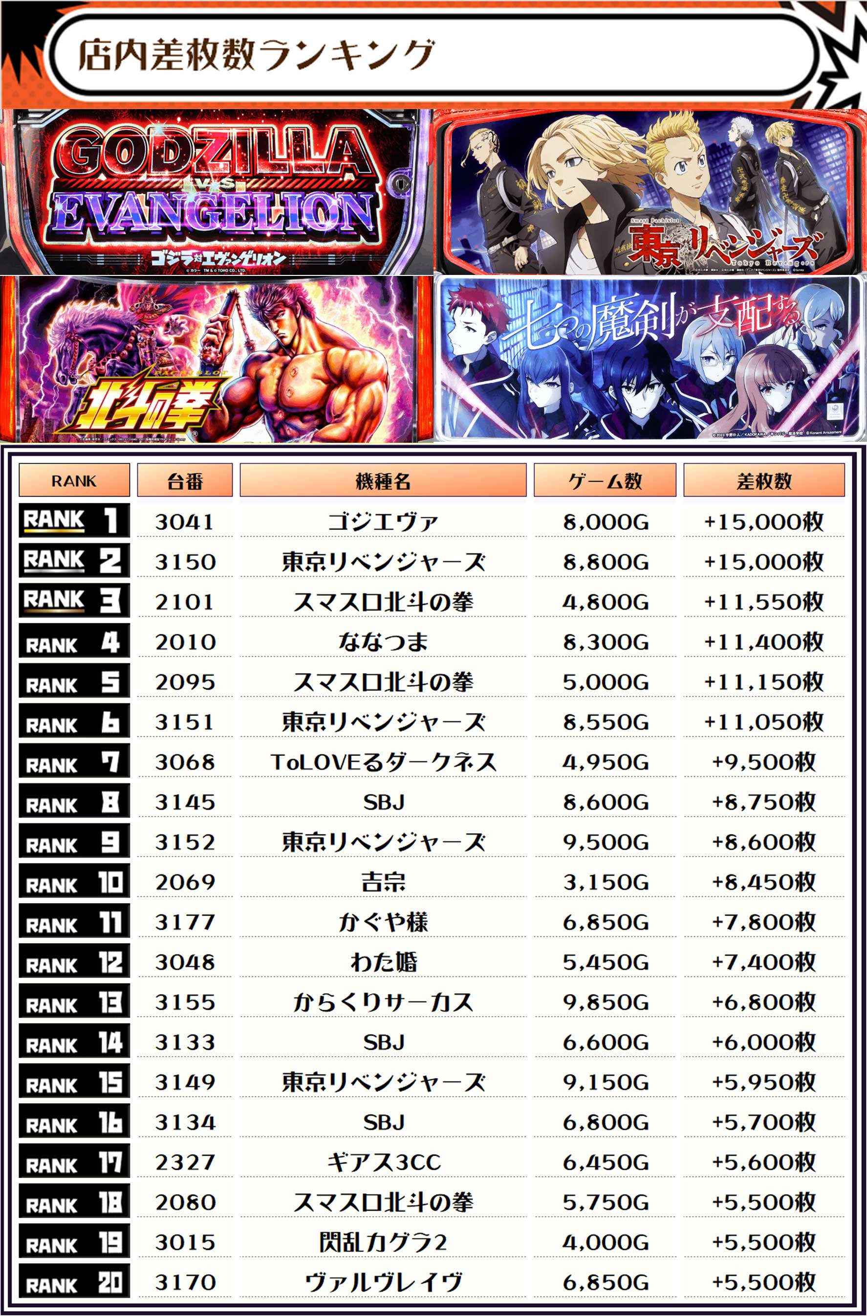 2位には【東京リベンジャーズ・3150番台】の+15,000枚、そして3位には【スマスロ北斗の拳・2101番台】の+11,550枚がランクイン✨