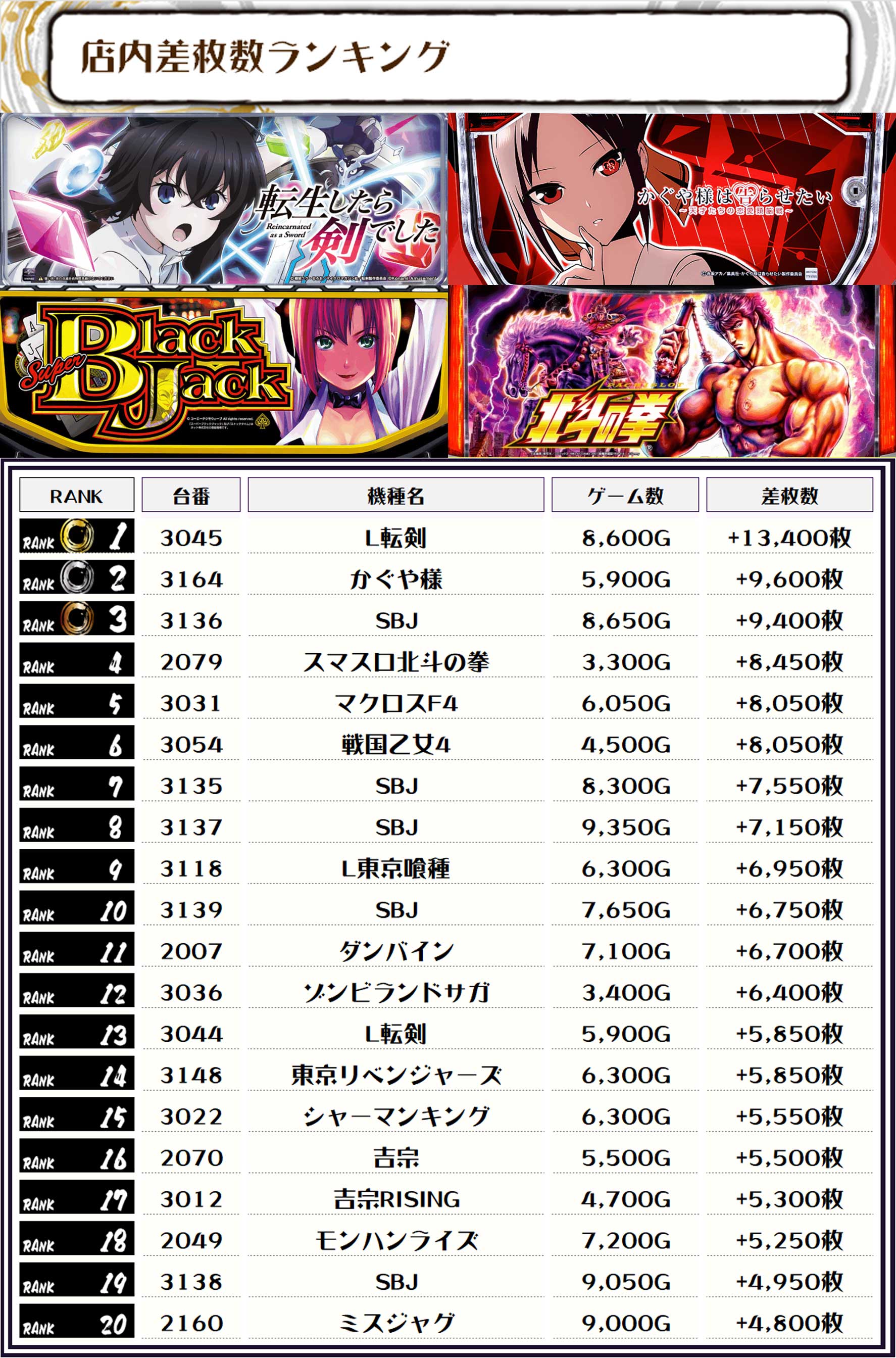 差枚ランキングでTOPに輝いたのは【L転剣・3045番台】で+13,400枚‼️