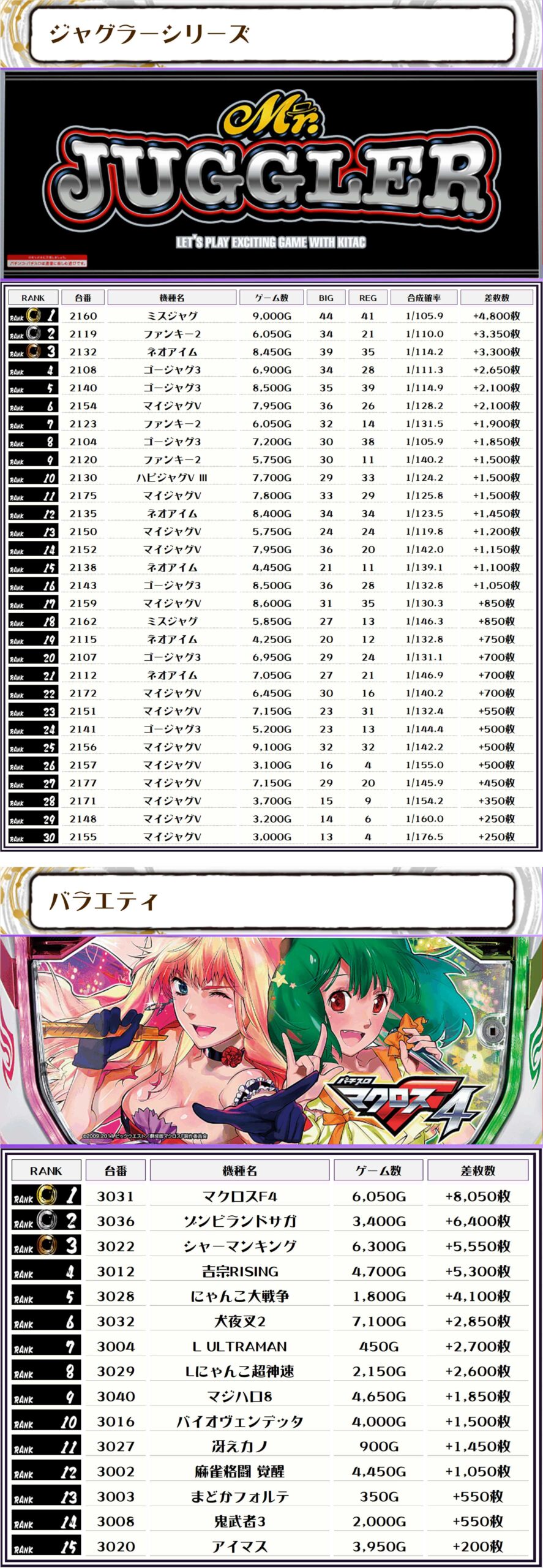 それでは、この日の機種別ランキングを見ていきましょう‼️
