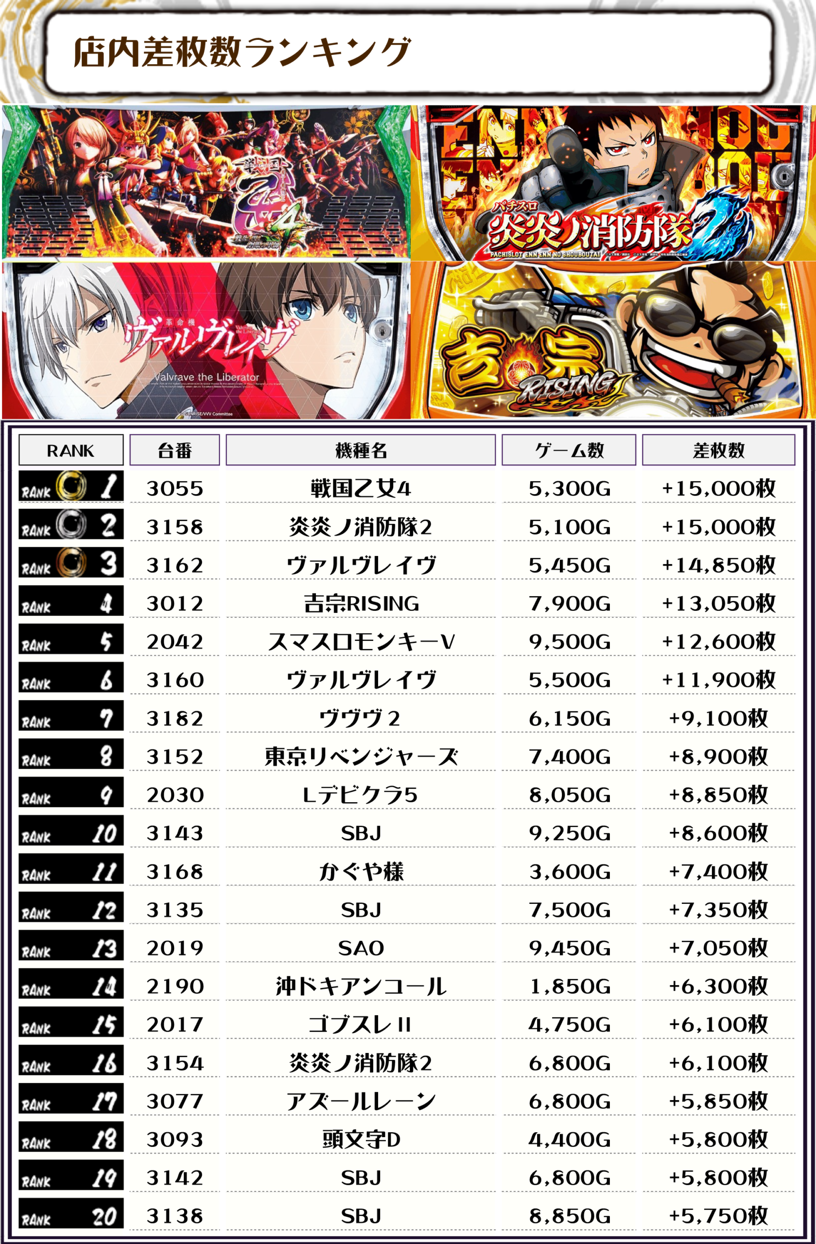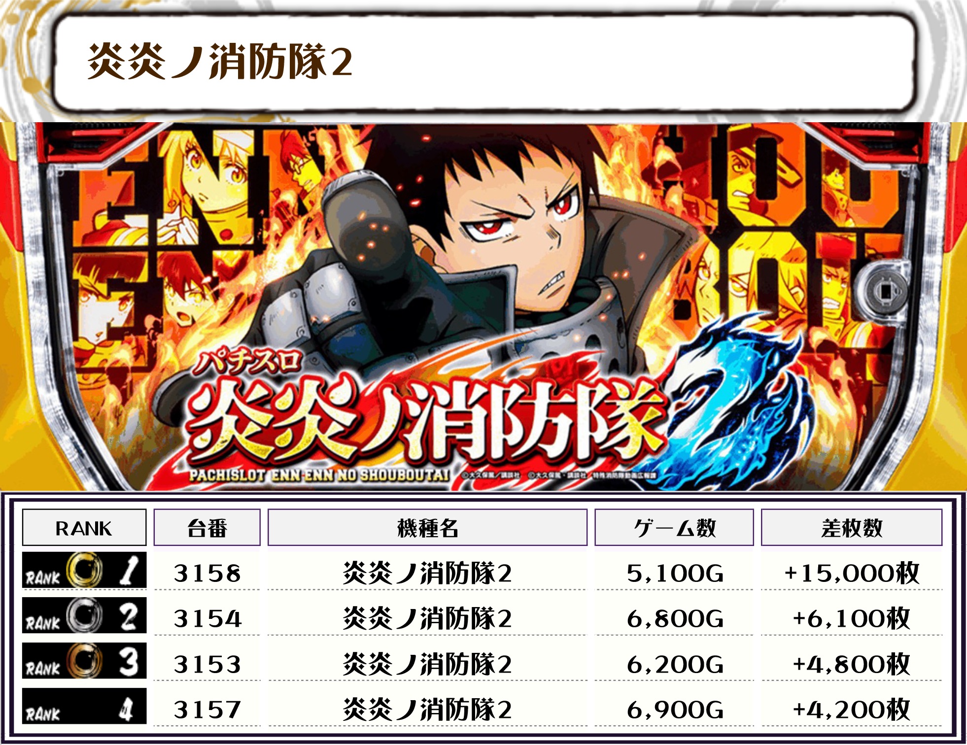 2位には同率枚数で【炎炎ノ消防隊2・3158番台】の+15,000枚、そして3位には【ヴァルヴレイヴ・3162番台】の+14,850枚がランクインっ🏆🏆🏆